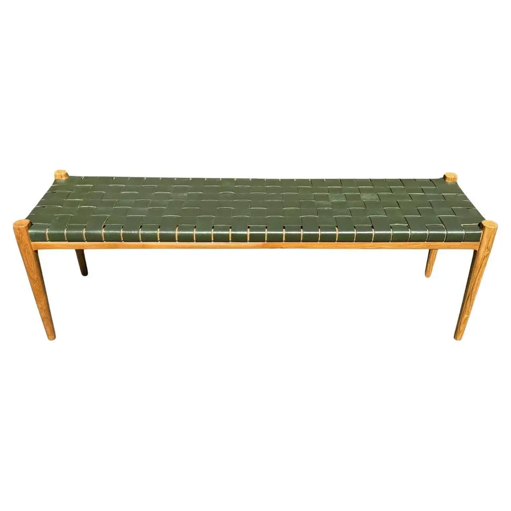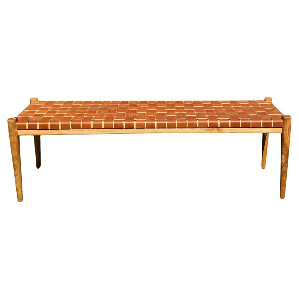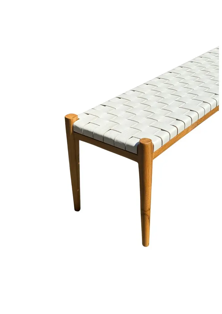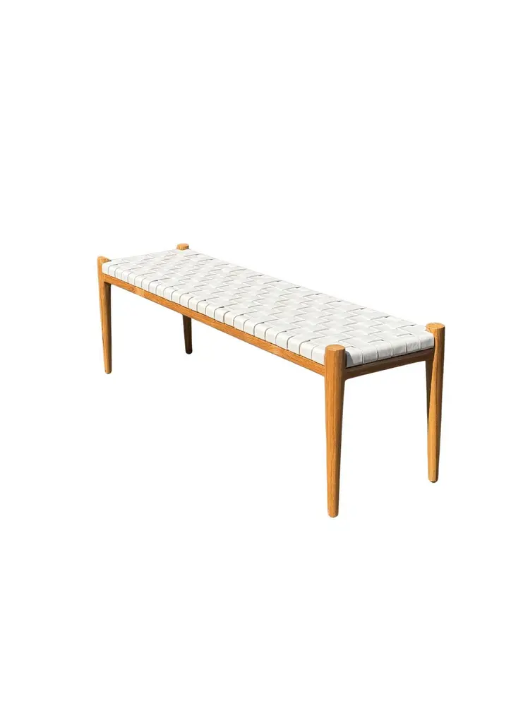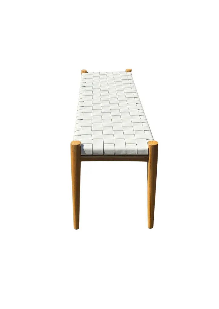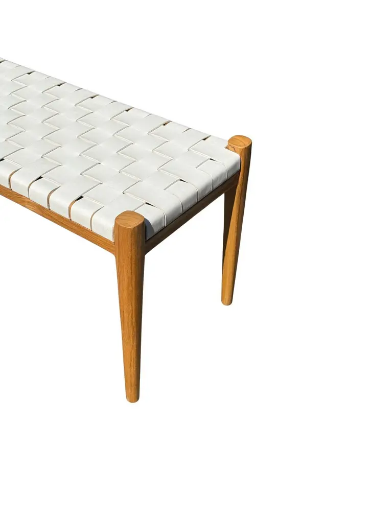 A hand-crafted teak framed & woven leather strap bench. These benches are crafted by local artisans using a wood joinery technique without the use of nails. They feature a subtle wood texture and are robust and sturdy.