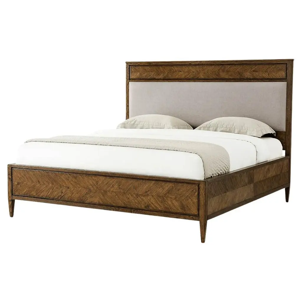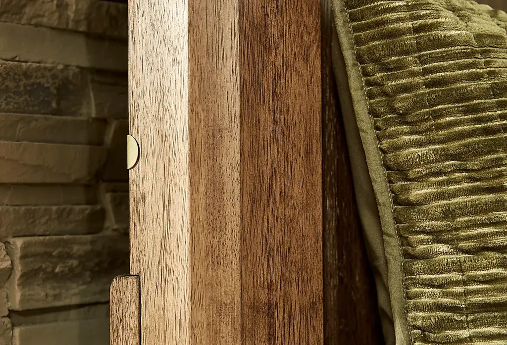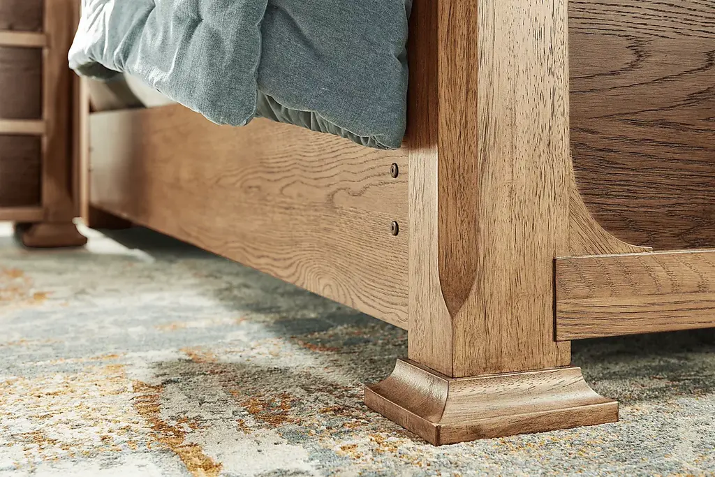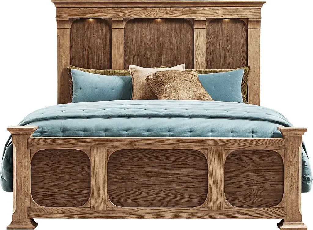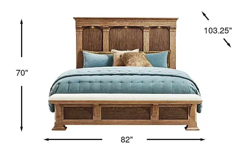 Quiet mornings and unwinding into restful evenings comes effortlessly with the Telluride collection from Cindy Crawford Home, creating a tranquil retreat through warm tones and comforting details. Designed to highlight the natural intricacies of its wood grain look, this traditional bed is crafted with oak veneers in a beautifully layered two-tone finish of light and dark brown. The headboard, framed by contrasting pillars and cove molding, features integrated LED lighting that accentuates each panel with a soft, luxurious glow. The footboard offers extra seating and an inviting touch of comfort with its ivory upholstered bench. Mattress and foundation (if required) sold separately. Bed shown is queen size.