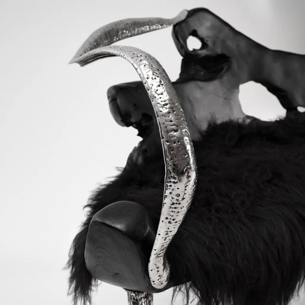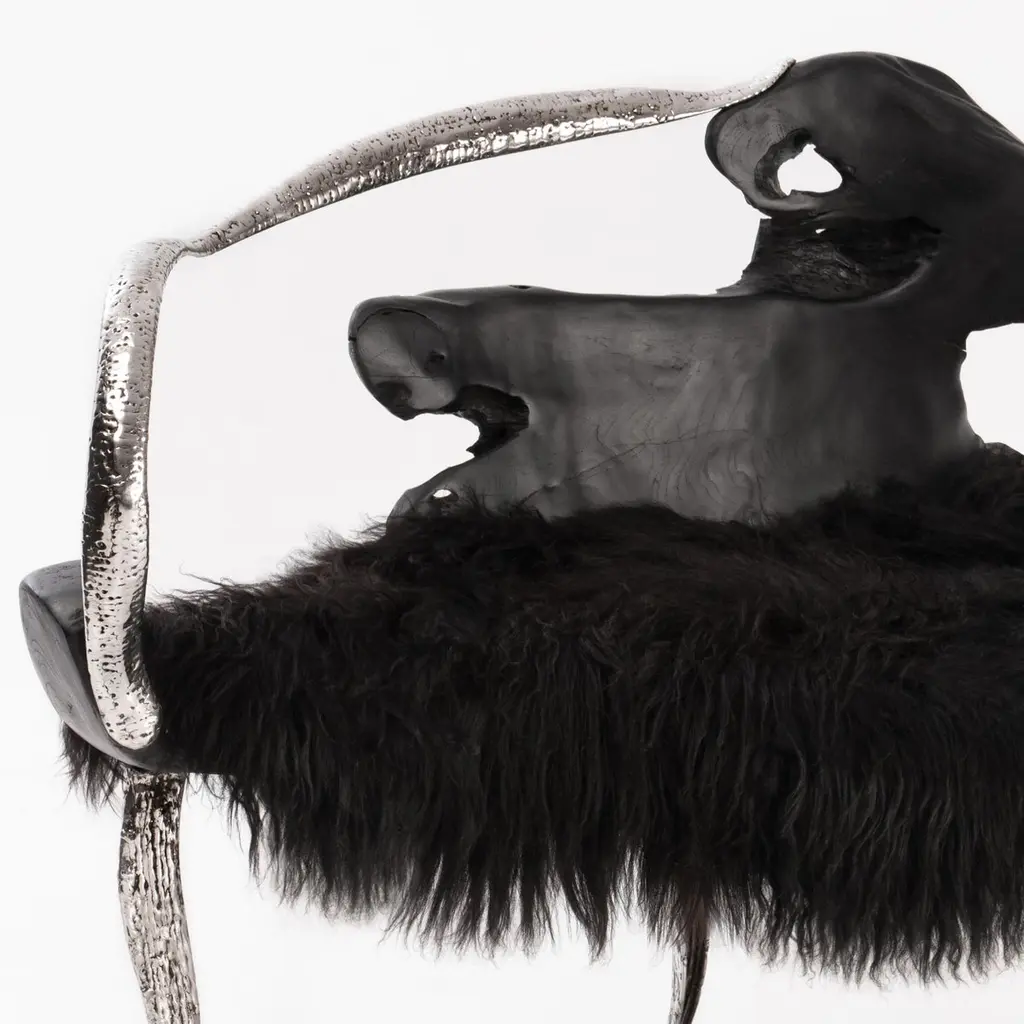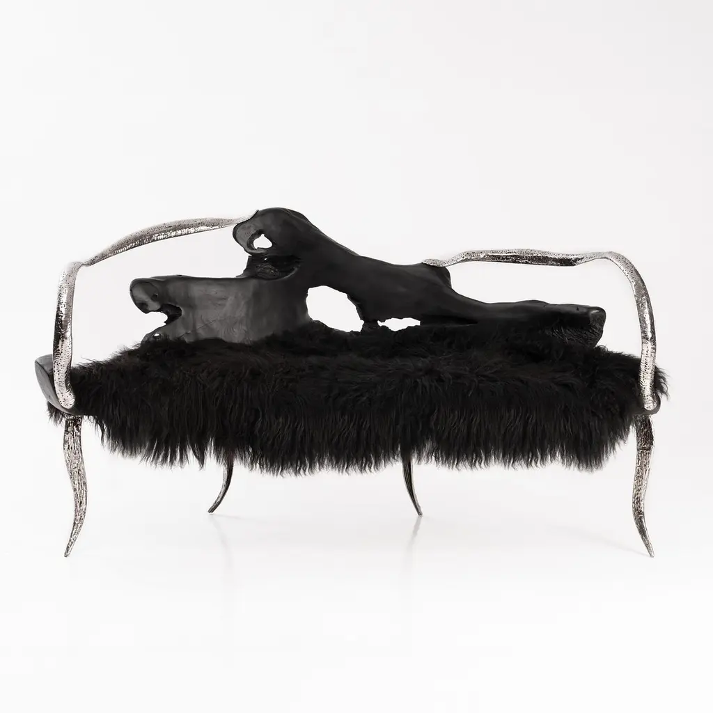 The Dark Knight Bench by OdditiDimensions: W 179 x D 85 x H 95 cmMaterials: FSC Certified Teak, Icelandic Sheepskin, SS304 Grade Stainless Steel.A sleek, shadowy, organic silhouette. The Dark Knight steals the show with its bold sculptural form, hand carved from solid teak and it's endearing soft side, an Icelandic sheepskin draped seat. Premium stainless steel, hand welded naturally flowing limbs add even more character to the piece.WORLD OF ODDITIOdditi takes a curious look at the relationship between nature and humanity, exploring our inner and outer landscapes and creating objects that live between the worlds of art and design.A creative collaboration between Haydee Dowse and Jonathan Glaser, a couple in design and life, with original roots planted in Sydney and Stockholm. Odditi, as an extension of its creators, is nomadic by nature with creative spaces in Australia and Sweden.“We treat life as art and our way of living becomes connected to our way of creating. Our pieces are born from a deep inherent need to create, a natural yet undeniable process, where an idea must be brought to life”Odditi pieces are shaped by abstracting forms from nature and transforming them into surreal objects that exist between nature, and our perception of it. “We recognise the importance of our connection to nature and the positive effect it has on our lives, seeking to bring fragments of the wild natural world into our spaces.”