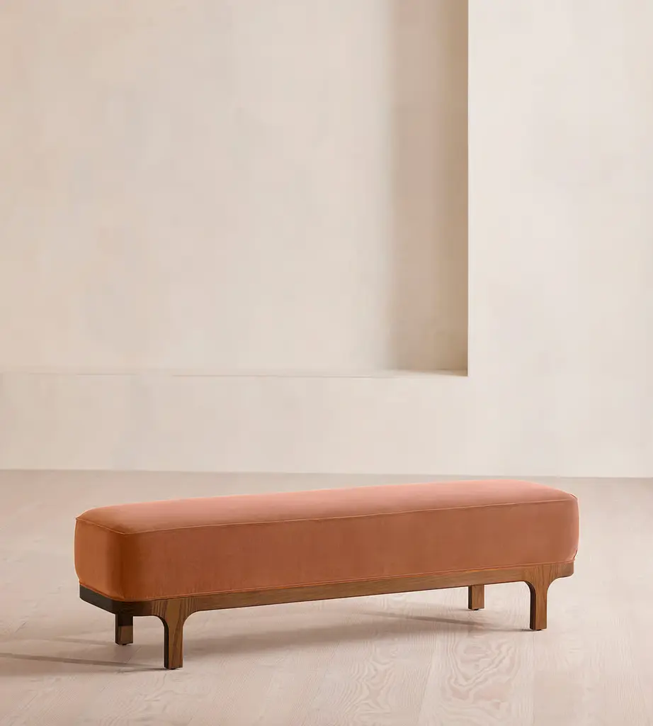 The Perry Bench carries mid-century Scandinavian design influences into the home with its soft shape and pleated details. Tight upholstery and blind seams lend the design a smooth finish. Handcrafted in North Carolina.