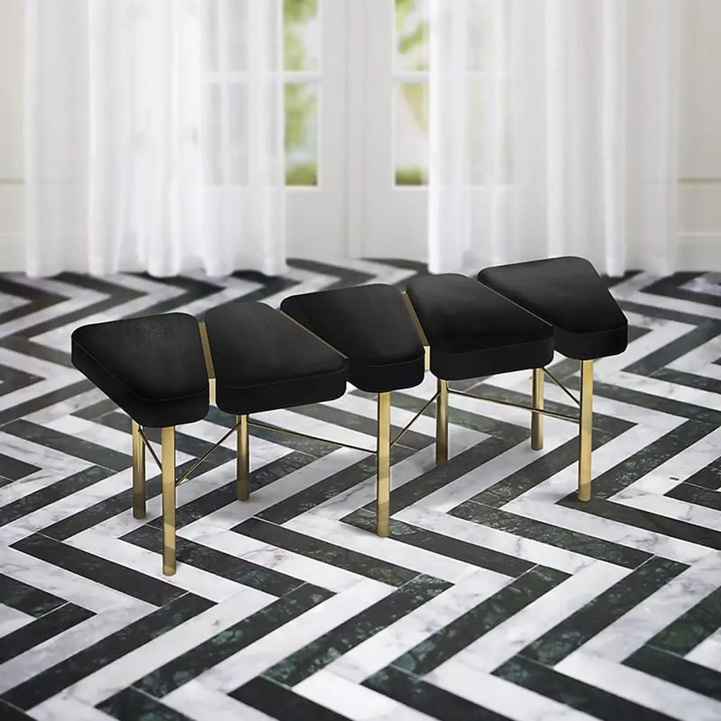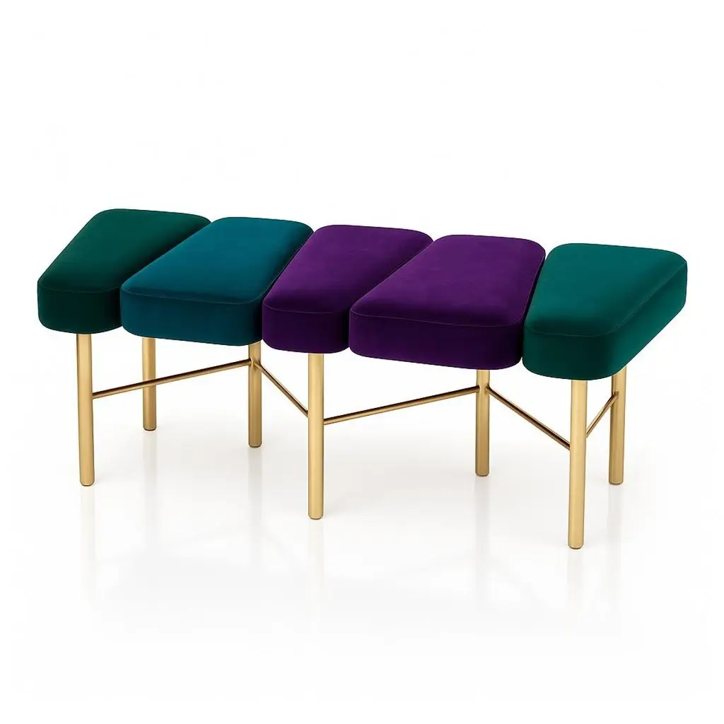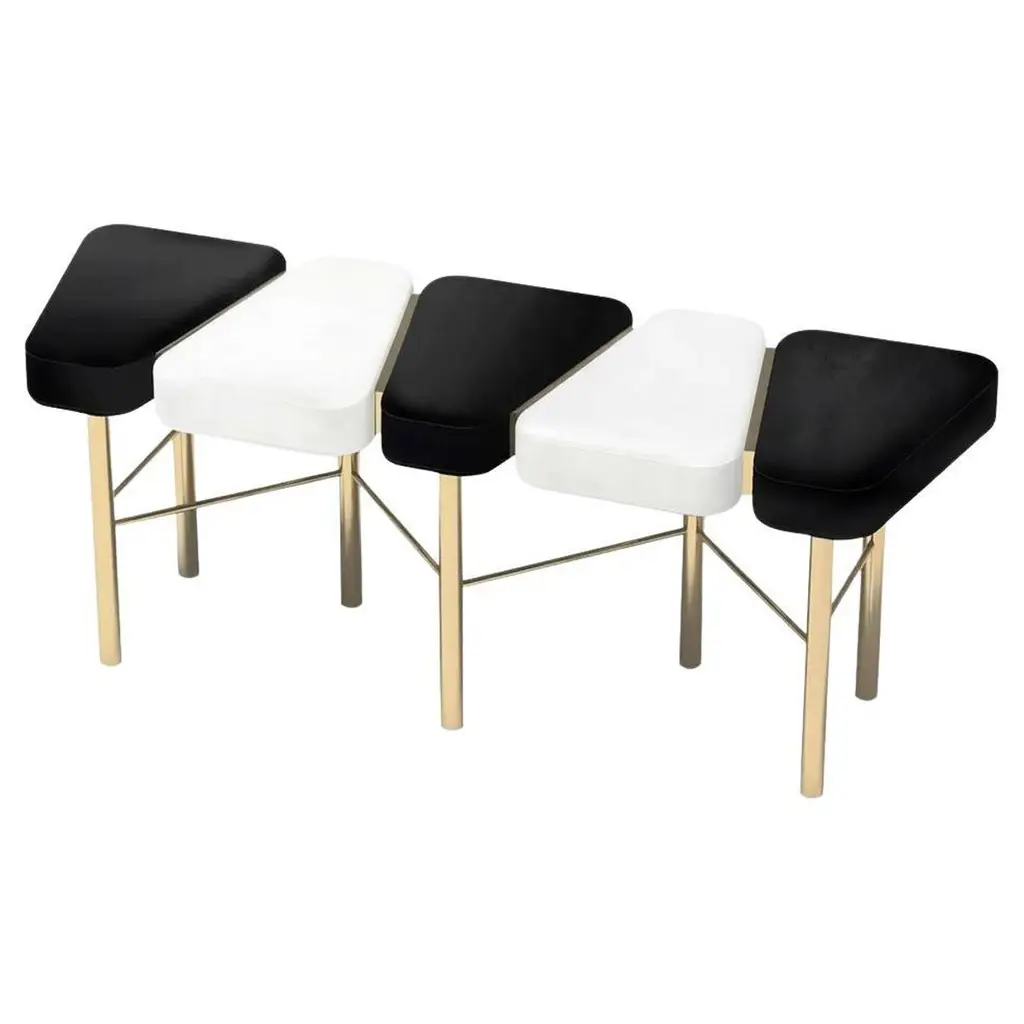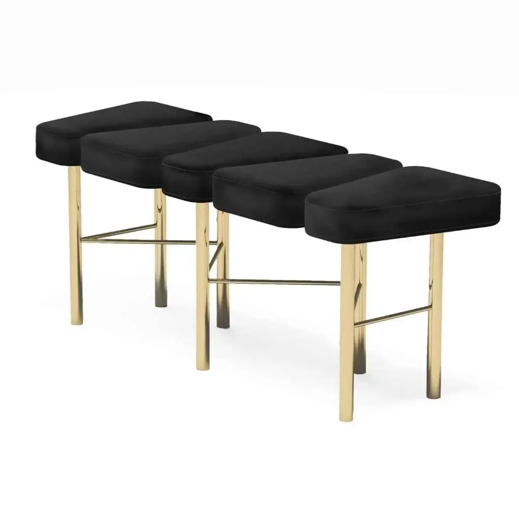 Crafted with meticulous attention to detail, this luxurious bench is a standout piece that combines striking design with ultimate comfort. The entire structure is forged from brushed gold metal, giving it a warm, sophisticated glow and a sleek, contemporary silhouette.The seat is a study in plush comfort, divided into distinct segments that are generously padded and upholstered in a lavishly soft velvety fabric. This thoughtful segmentation not only creates a unique visual texture but also enhances the feeling of opulence and comfort. This bench is designed to be a luxurious and inviting addition to any space, whether placed in an entryway, a living room, or at the foot of a bed.Materials:Upholstery: VelvetStructure: Brushed BrassContact us to enquire about COM/COL production, requirements and material shipping instructions.Please contact us if you have any questions about customization and pricing. We will be glad to check with the factory’s technical team if sizes, finishes, and colors can be customized. We do our best to expedite production and to ship and deliver product within the listed lead time, however current lead times might be longer due to global shipping backlog and delays. These delays are out of our control and cannot be a reason to cancel an order.