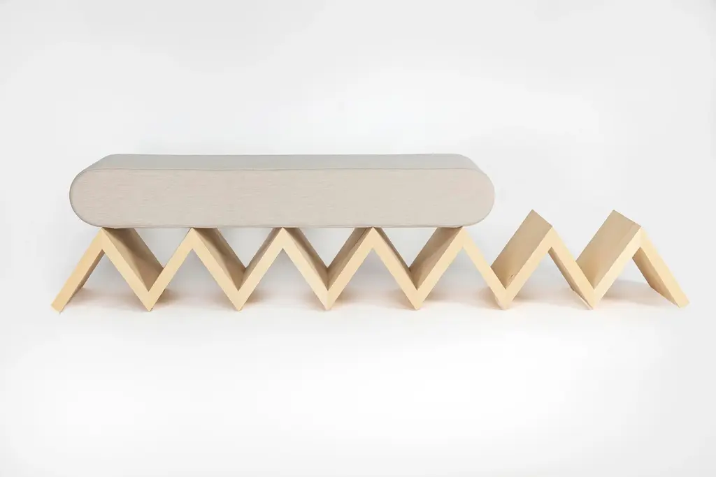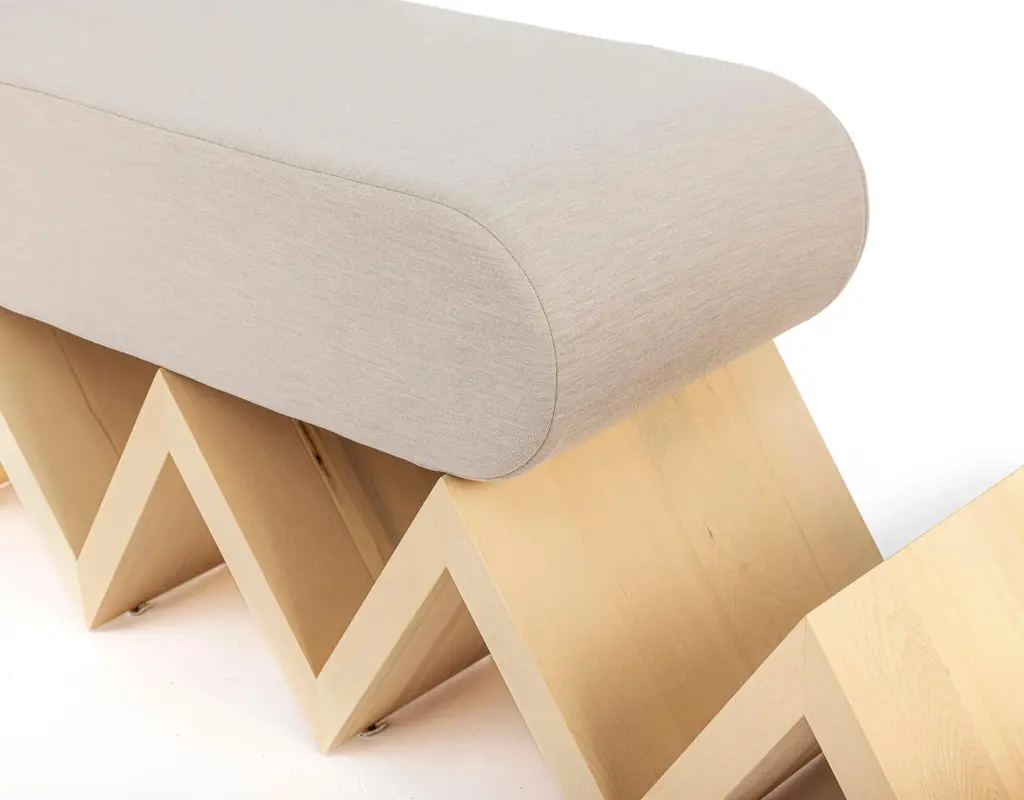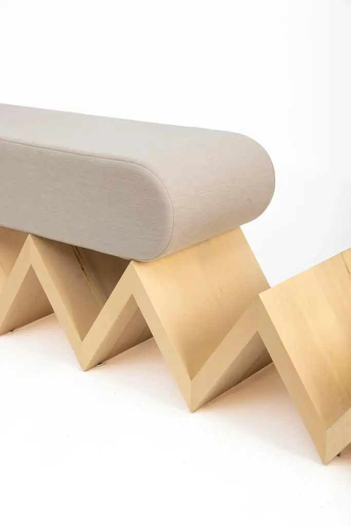The Vow Bench by Geke Lensink Dimensions: D36 x W210 x H50 cm Materials: alaskan yellow cedar, cushion and knitted After graduating from ArtEZ University of the Arts, Geke Lensink started working as an independent interior designer, setting up many exhibitions and stands for numerous clients. Twelve years ago, she decided to chase her dreams and devote herself entirely to designing furniture. For Geke Lensink, furniture is not merely a collection of objects, but also a carrier of stories. The designer translates her own memories of travels and cultures into her autonomous work and all objects are a fusion of thoughts and ideas. Her recent designs is about our world in which segregation slowly merges and the diversity of the global community becomes more visible, but it is also about acceptance and arrogance. The reflections on these subjects are made tangible in minimalist designs with bright colours, creating a balance between functionality and beauty. The use of natural materials is a matter of course for Geke.