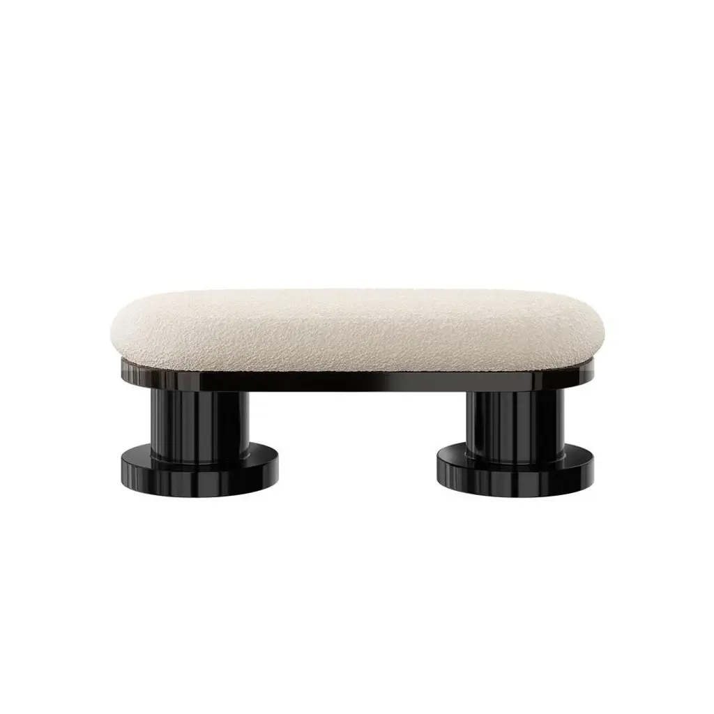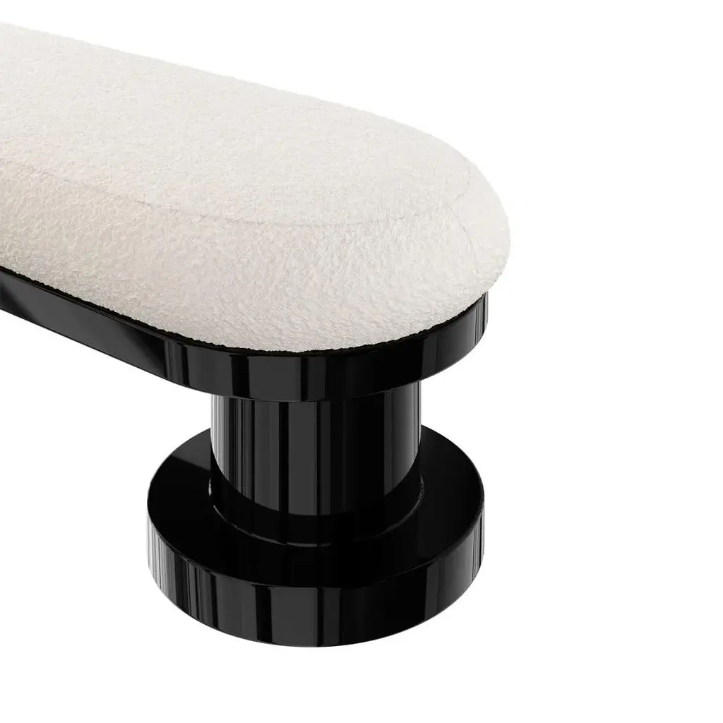 The Theo Bench is a modern design piece with a contemporary edge. It blends functionality with bold design elements. Featuring a wooden base and soft velvet upholstery, it embodies a fresh. The bold round legs of this modern bench create a striking visual impact, making it an ideal choice for edgy hallways or cool living rooms. The Theo Bench offers style, comfort, and sophistication, perfect for modern interior design projects. Dimensions:Width: 129 cm | 50.8 in – Depth: 54 cm | 21.3 in – Height: 47 cm | 18.5 in - Seat Height: 47 cm | 18.5 in Materials:Upholstered in Boucle White; Legs in Glossy Black Lacquer