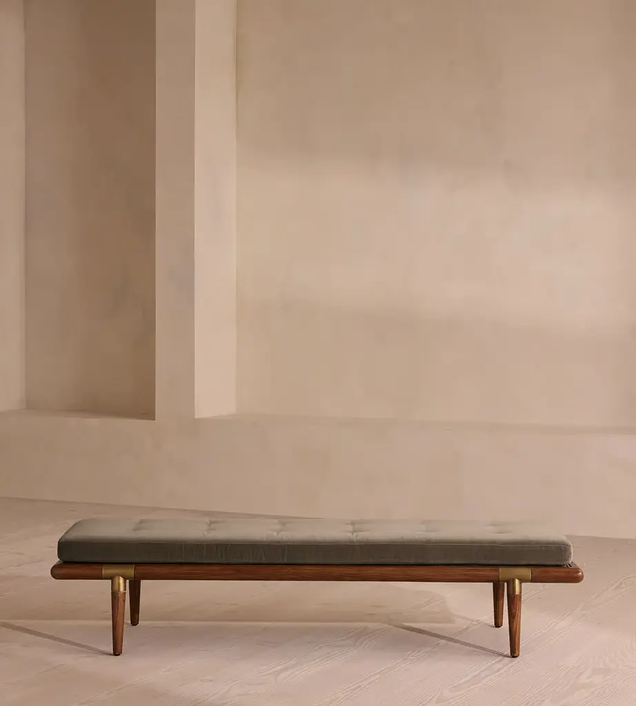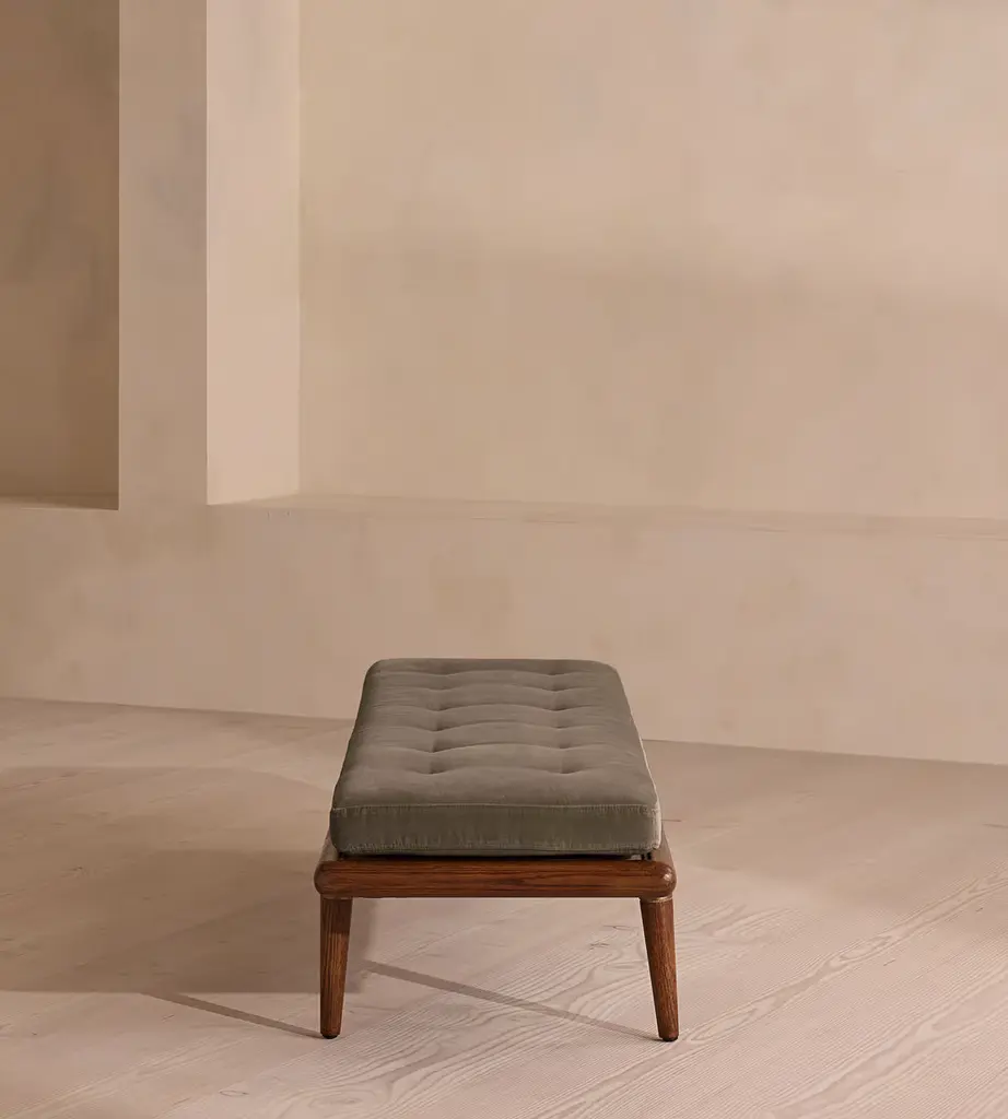 A blind-tufted, feather-wrapped seat cushion is upholstered in velvet to create a wide silhouette made for relaxing. Taking cues from Soho House 40 Greek Street with the brass detailing at the bottom of its birch and oakwood legs, this bench is designed to pair with the Theodore armchair or mix and match across the rest of our collection. Its blind-tufted, feather-wrapped seat cushion is upholstered in velvet and co-ordinates with a bolster cushion secured by a single strap.