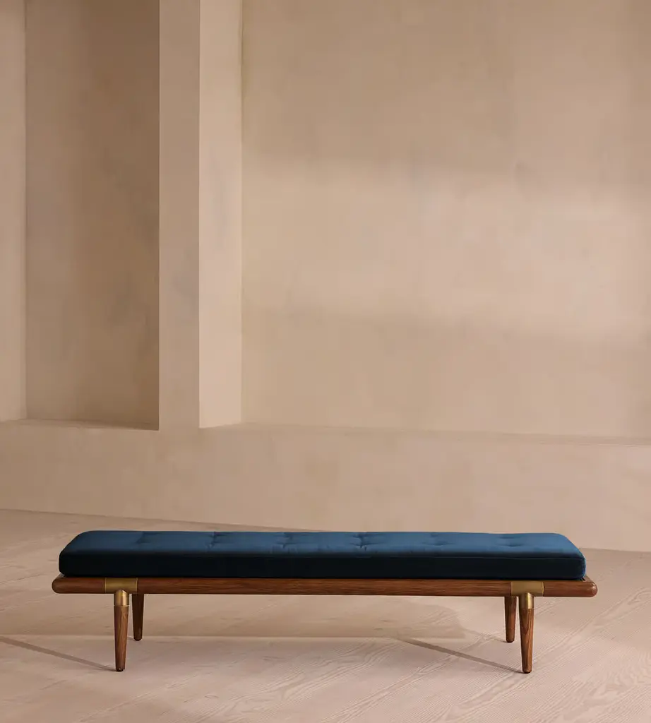 A blind-tufted, feather-wrapped seat cushion is upholstered in velvet to create a wide silhouette made for relaxing. Taking cues from Soho House 40 Greek Street with the brass detailing at the bottom of its birch and oakwood legs, this bench is designed to pair with the Theodore armchair or mix and match across the rest of our collection. Its blind-tufted, feather-wrapped seat cushion is upholstered in velvet and co-ordinates with a bolster cushion secured by a single strap.