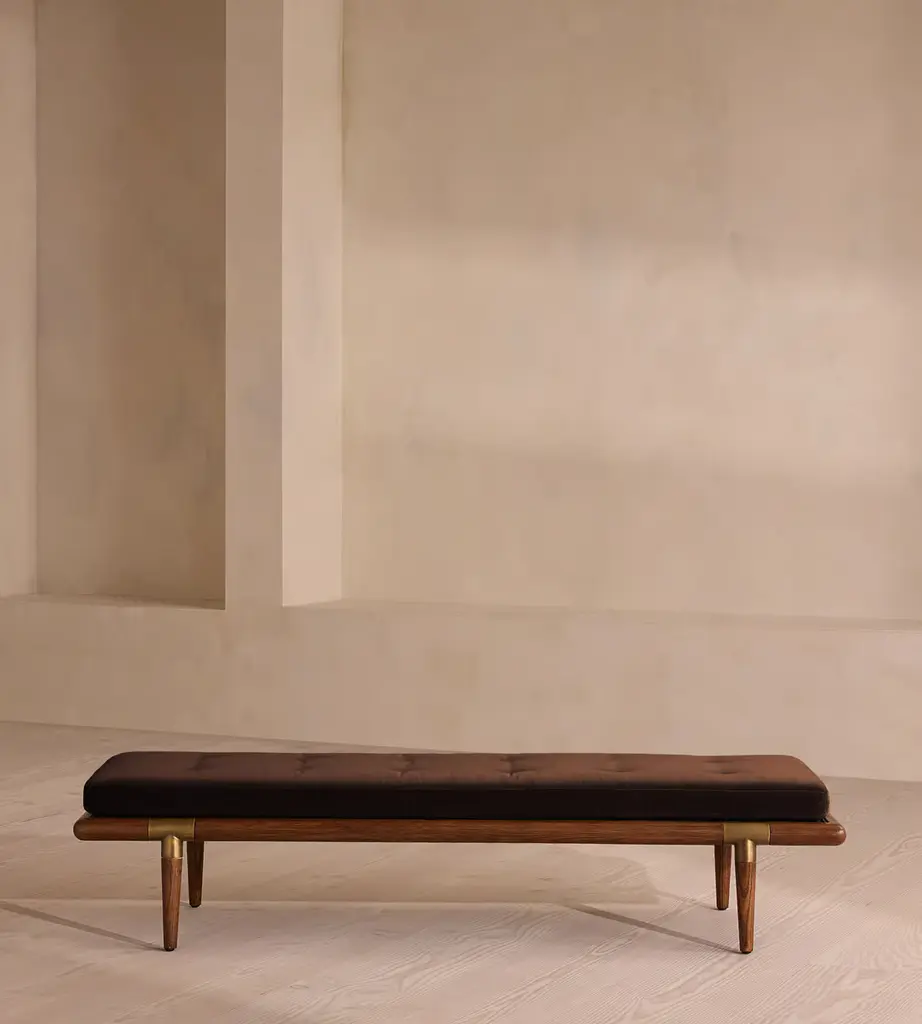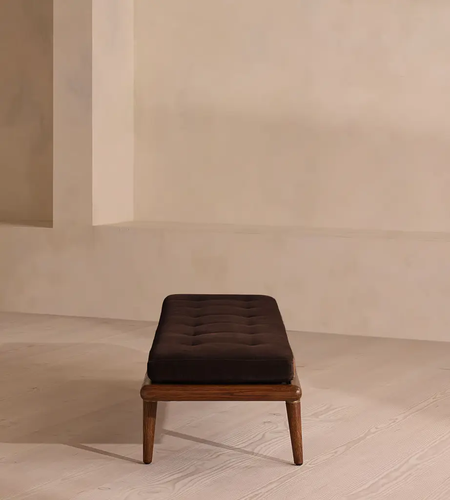 A blind-tufted, feather-wrapped seat cushion is upholstered in velvet to create a wide silhouette made for relaxing. Taking cues from Soho House 40 Greek Street with the brass detailing at the bottom of its birch and oakwood legs, this bench is designed to pair with the Theodore armchair or mix and match across the rest of our collection. Its blind-tufted, feather-wrapped seat cushion is upholstered in velvet and co-ordinates with a bolster cushion secured by a single strap.