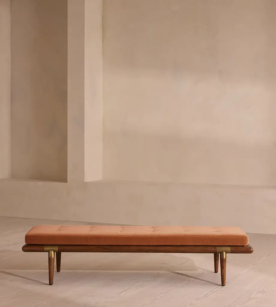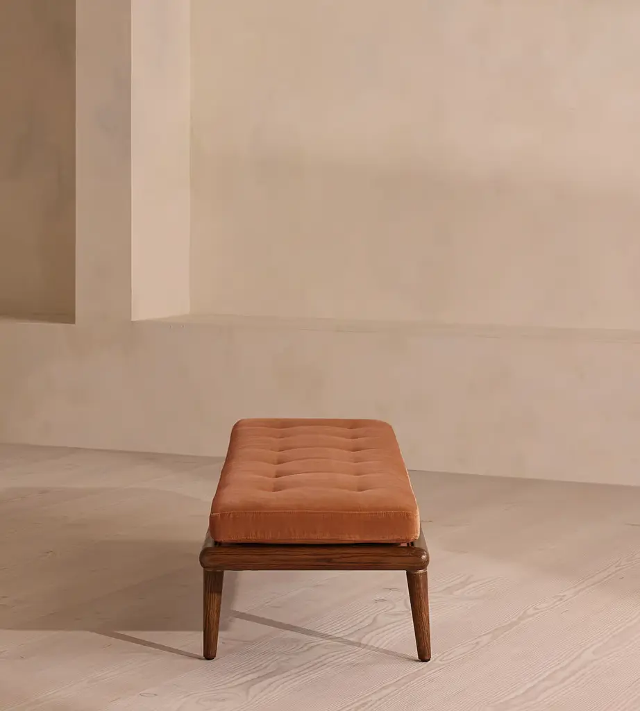 A blind-tufted, feather-wrapped seat cushion is upholstered in velvet to create a wide silhouette made for relaxing. Taking cues from Soho House 40 Greek Street with the brass detailing at the bottom of its birch and oakwood legs, this bench is designed to pair with the Theodore armchair or mix and match across the rest of our collection. Its blind-tufted, feather-wrapped seat cushion is upholstered in velvet and co-ordinates with a bolster cushion secured by a single strap.