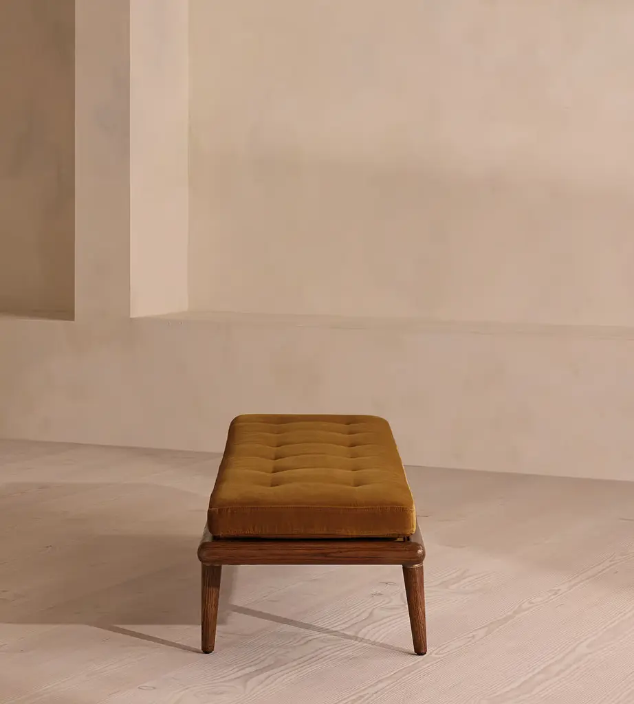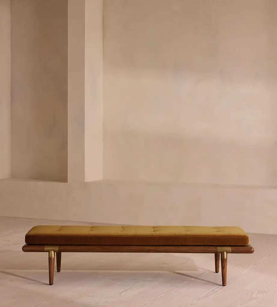 A blind-tufted, feather-wrapped seat cushion is upholstered in velvet to create a wide silhouette made for relaxing. Taking cues from Soho House 40 Greek Street with the brass detailing at the bottom of its birch and oakwood legs, this bench is designed to pair with the Theodore armchair or mix and match across the rest of our collection. Its blind-tufted, feather-wrapped seat cushion is upholstered in velvet and co-ordinates with a bolster cushion secured by a single strap.