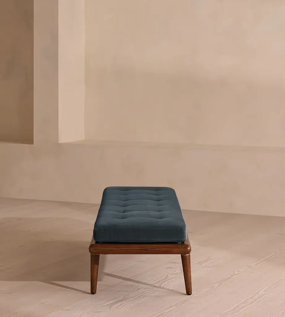 A blind-tufted, feather-wrapped seat cushion is upholstered in velvet to create a wide silhouette made for relaxing. Taking cues from Soho House 40 Greek Street with the brass detailing at the bottom of its birch and oakwood legs, this bench is designed to pair with the Theodore armchair or mix and match across the rest of our collection. Its blind-tufted, feather-wrapped seat cushion is upholstered in velvet and co-ordinates with a bolster cushion secured by a single strap.