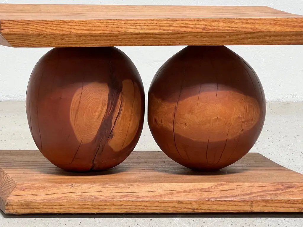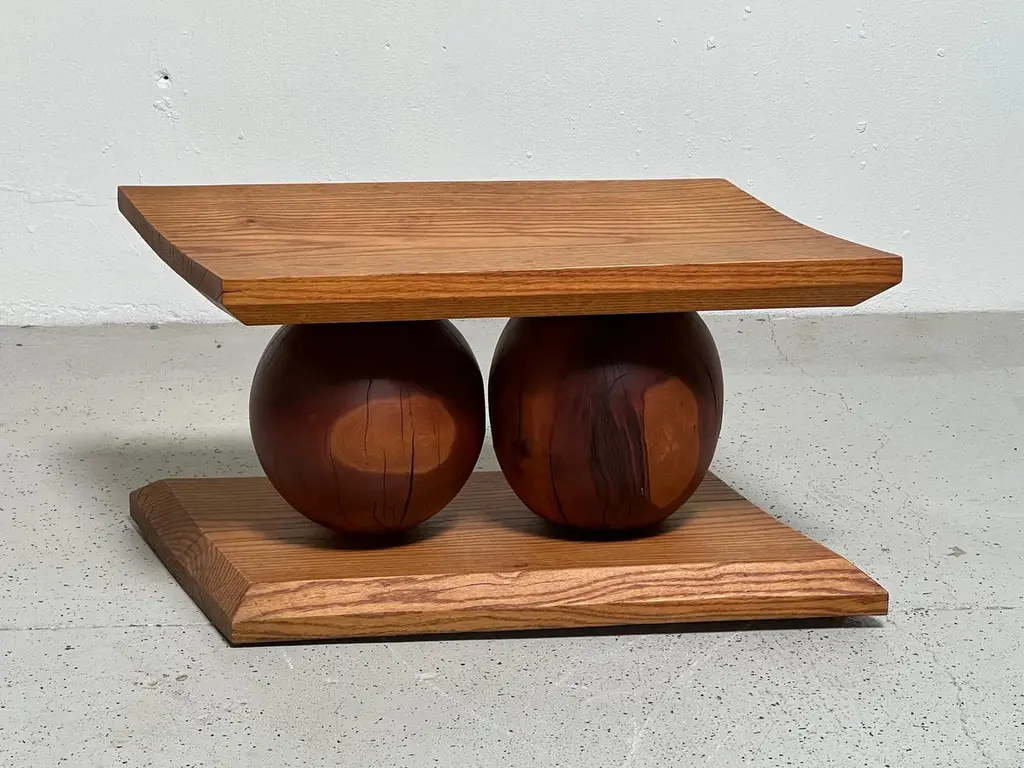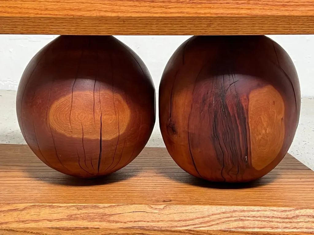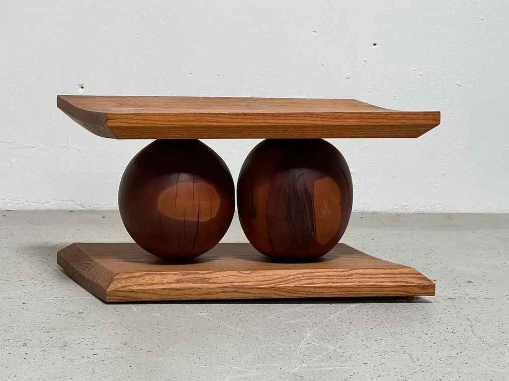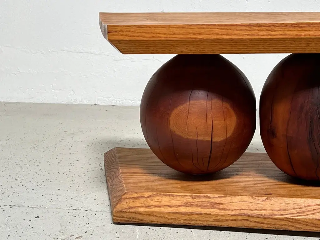 An oak and cherry studio craft bench made by Thomas Lacagnina, 1974. Tom Lacagnina received his BFA in 1970 and MFA in 1974 from the Rochester Institute of Technology. From 1969-1970 he worked as a studio assistant to Wendell Castle. He was the recipient of a Fulbright scholarship in 1975. From 2000-2022 he served as Professor Emeritus, School of Art and Design, New York State College of Ceramics, Alfred University, Alfred, New York. Through the 1980s and 90s his work was exhibited throughout the United States and shown at several prominent galleries. In 1990 he received a National Endowment for the Arts fellowship and in 1995 received the New York Foundation for the Arts Fellowship.