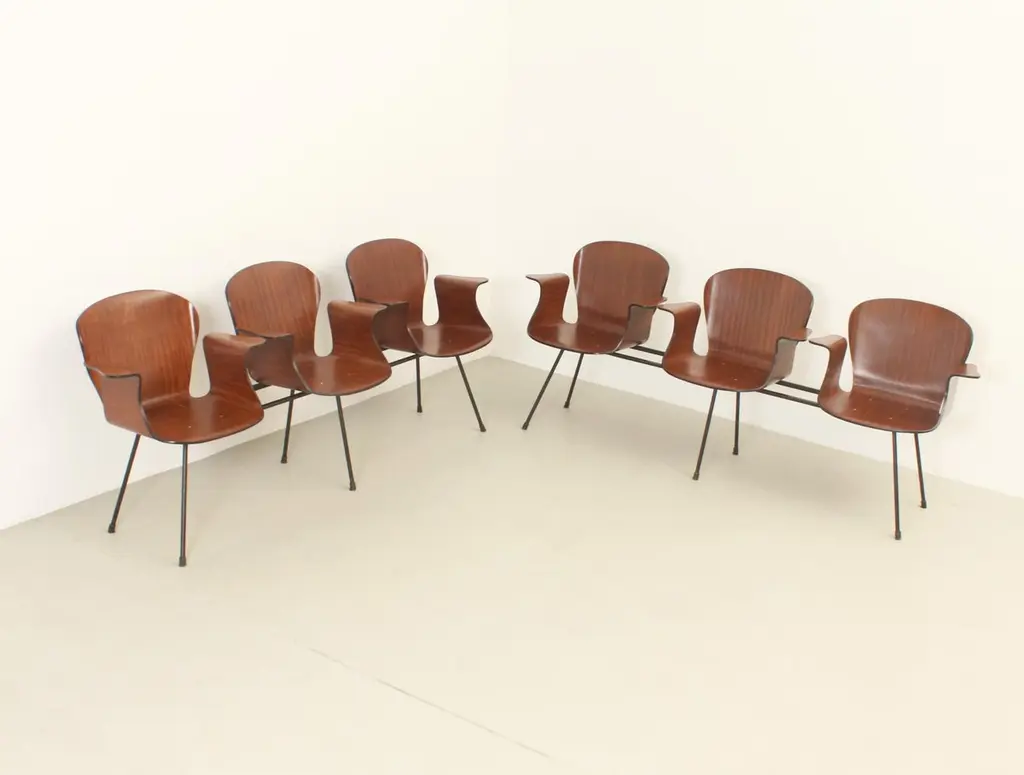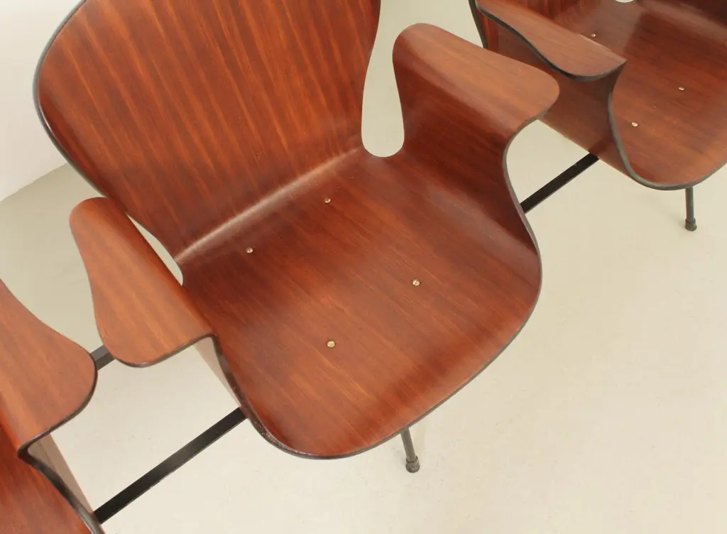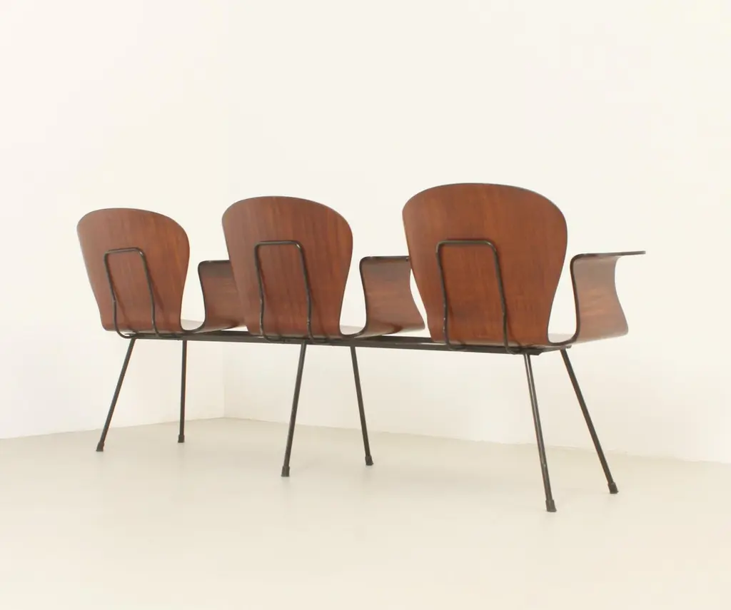 Three seater bench designed by Carlo Ratti in 1950's, Italy. Three seats in teak plywood with black lacquered metal frame. Rare model with sinuous curved shapes. Two pieces available.