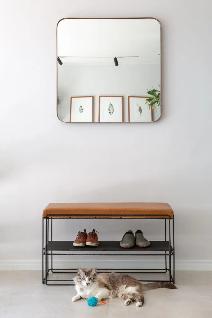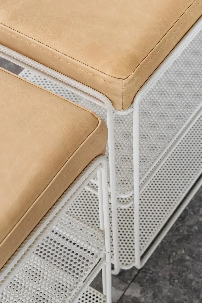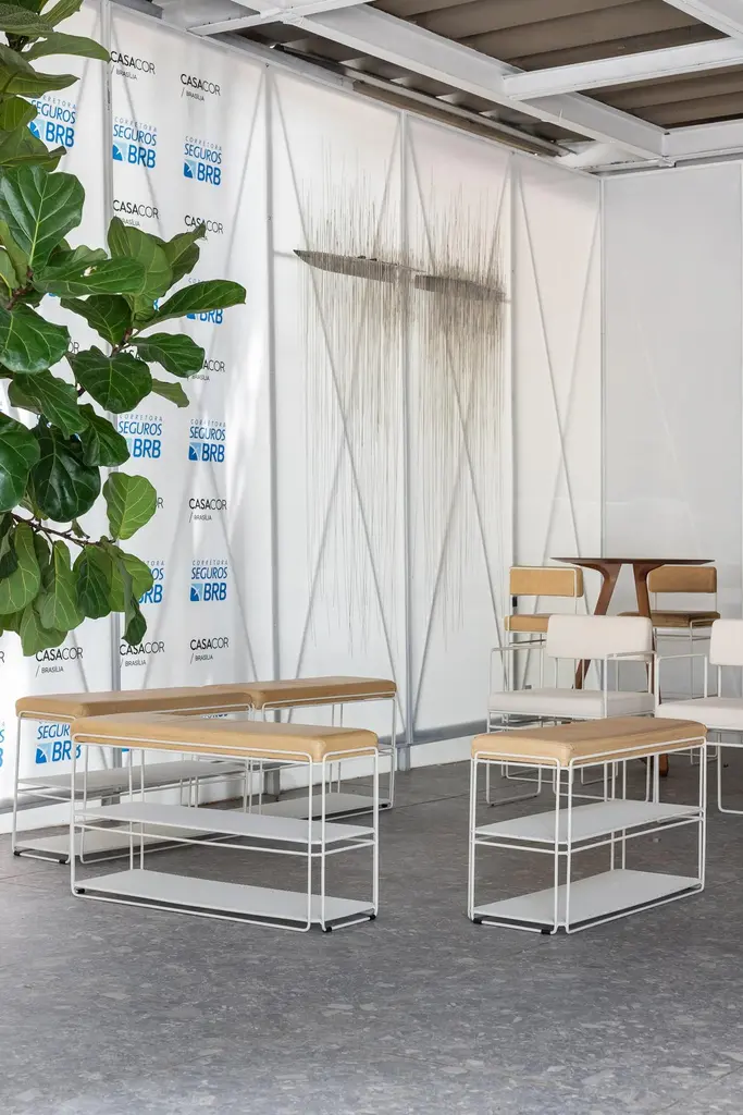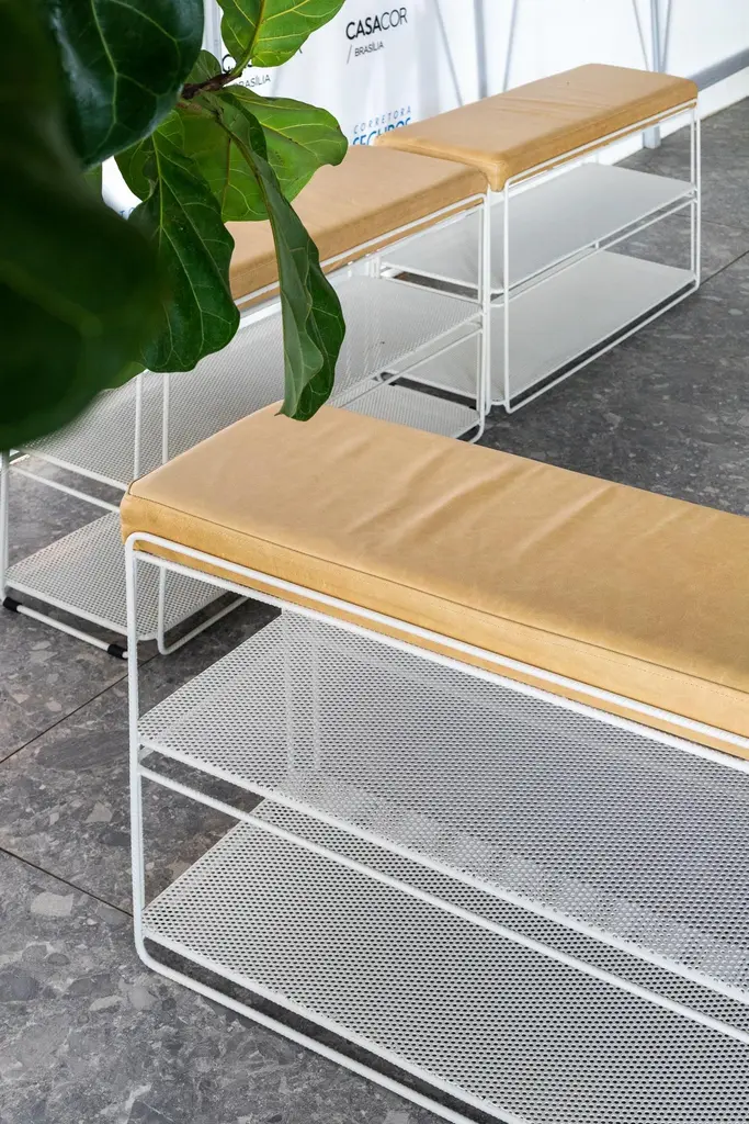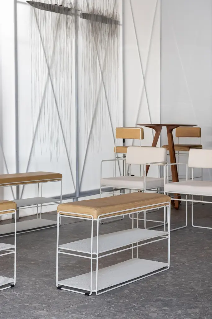 Inspired by the construction rebar columns used in buildings, the Tião product family beholds a strong relation with the Industrial style through its exposed metal frames contrasting to the seat upholstery. The name "Tião" is an homage to the workman mason, an important character in construction sites, especially those who left their hometowns to face the unknown in the endeavor of establishing Brasilia.The version of Tião bench with shoe rack was created in 2020 during the covd-19 pandemic, aiming to meet the habit of taking off shoes when entering the house'Tião', the shortening of "Sebastião" in Brazil, was a common name among lower-income classes through the time of construction of Brasilia, and is commonly used to refer to unseen people, marginalized in society, similar to "Joe Blow" or "Joe Bloggs". Another name used in the same context is "Zé". (Translator's Note).