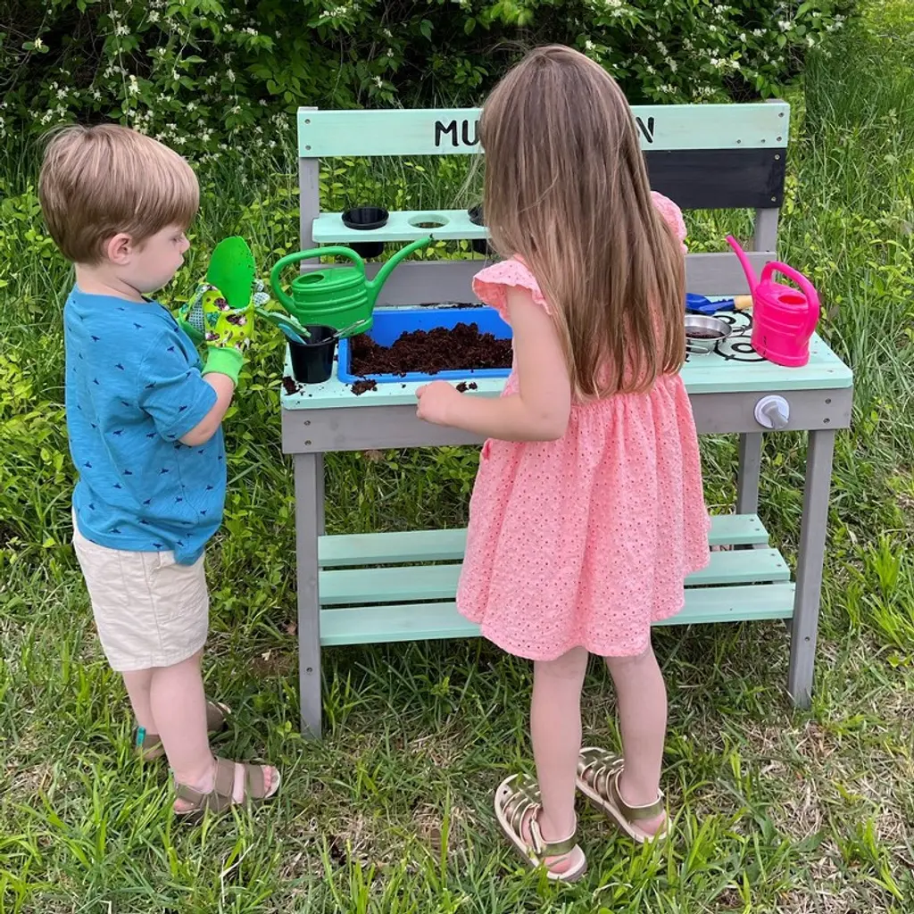 The Wooden Mud Kitchen encourages active engagement and imaginative hands-on play. It includes turning knobs, four simulated stove burners, and open shelves for storing dishes, play food, toys, and more. Ideal for classrooms, daycares, preschools, homes, and beyond, this versatile wooden kitchen playset is designed for safety with rounded edges and corners to prevent splinters or cuts. Dimensions: 31.5" L x 15" W x 35" H, weighing 16 lbs. Assembly instructions are provided; a cordless drill is recommended for ease of assembly.