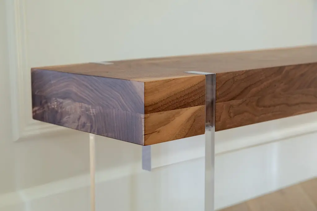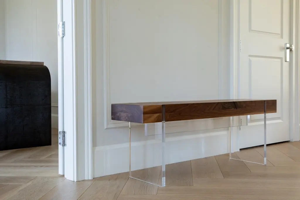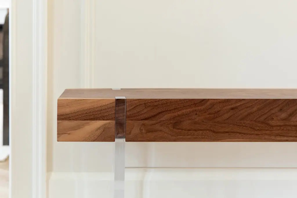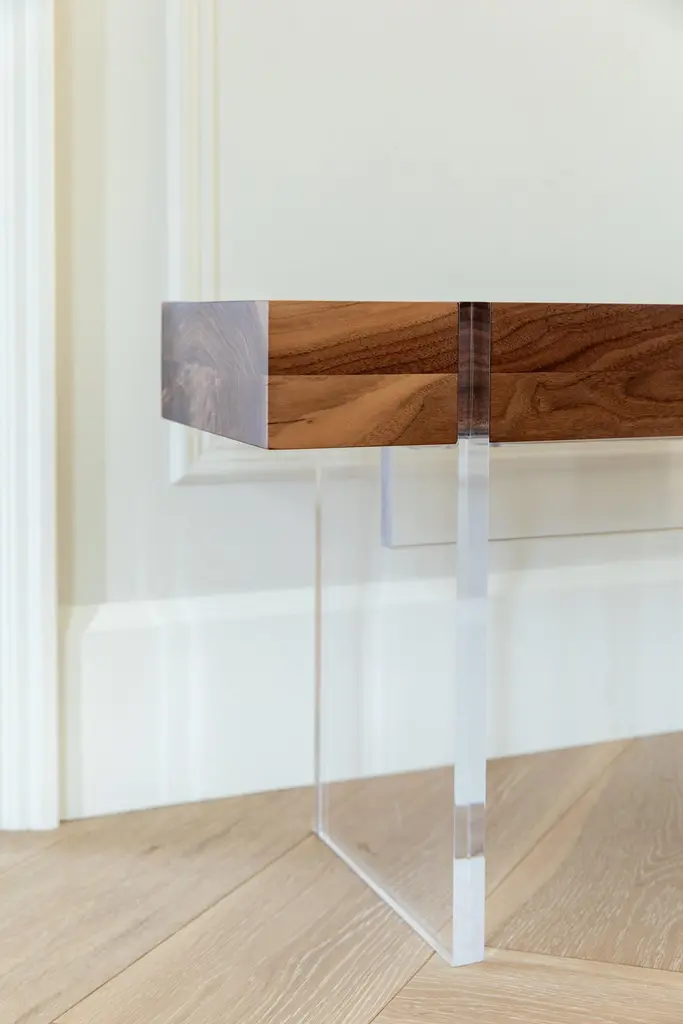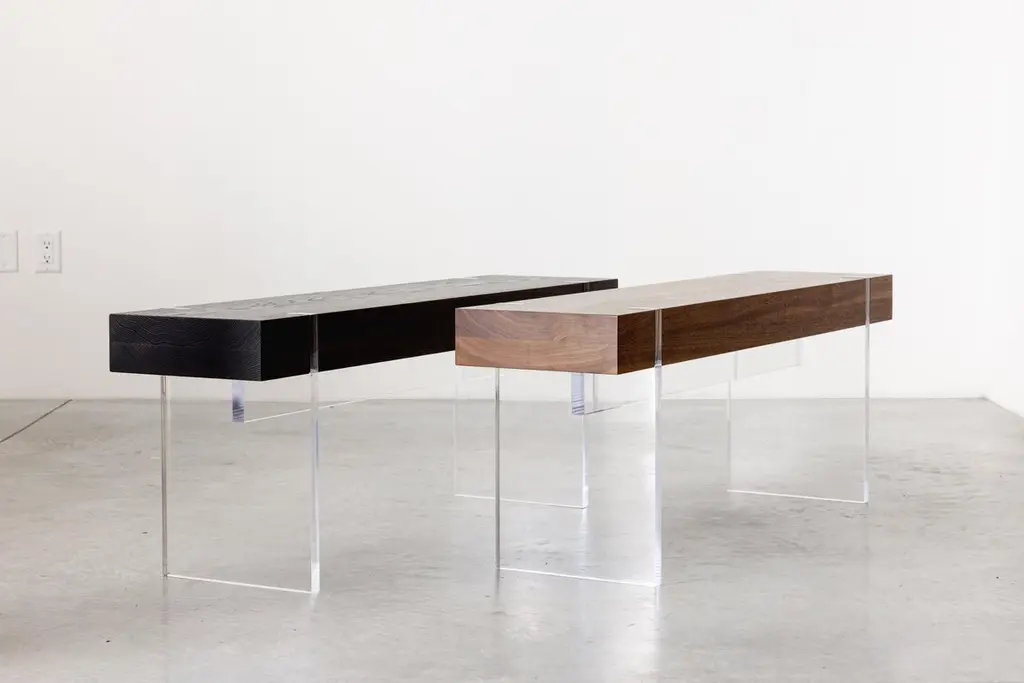Step into contemporary elegance with the Tillikum Walnut Bench by Autonomous Furniture. Crafted with precision, this bench is more than just furniture; it's a statement piece for design-driven individuals seeking sophistication. Perfectly tailored for modern spaces, this bench seamlessly blends natural Black Walnut with clear acrylic legs, creating an ethereal, floating effect that captivates the eye. The juxtaposition of the polished acrylic legs against the rich Walnut top adds a dynamic visual contrast, elevating the bench to a work of art.Whether placed in an entryway, under a window, or as a hallway bench, its minimalist design, accentuated by the sleek acrylic legs, adds a touch of modernity to any room. Designed by Kirk Van Ludwig, renowned for his minimalist lines and innovative use of materials, this bench reflects his commitment to timeless design.Each piece is crafted with sustainability in mind, aligning with our goal of benefiting the circular economy. Elevate your home with the Tillikum Walnut Bench – where contemporary design meets unparalleled craftsmanship and the clear acrylic legs add a touch of modern sophistication.Specifications:48" L x 12" W x 18" H. Customized length available.Black Walnut, also available in Torched Oak, White Oak, and Ash.