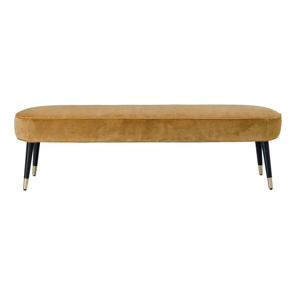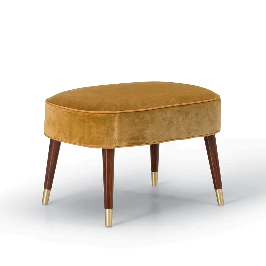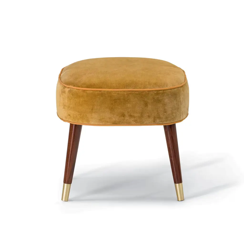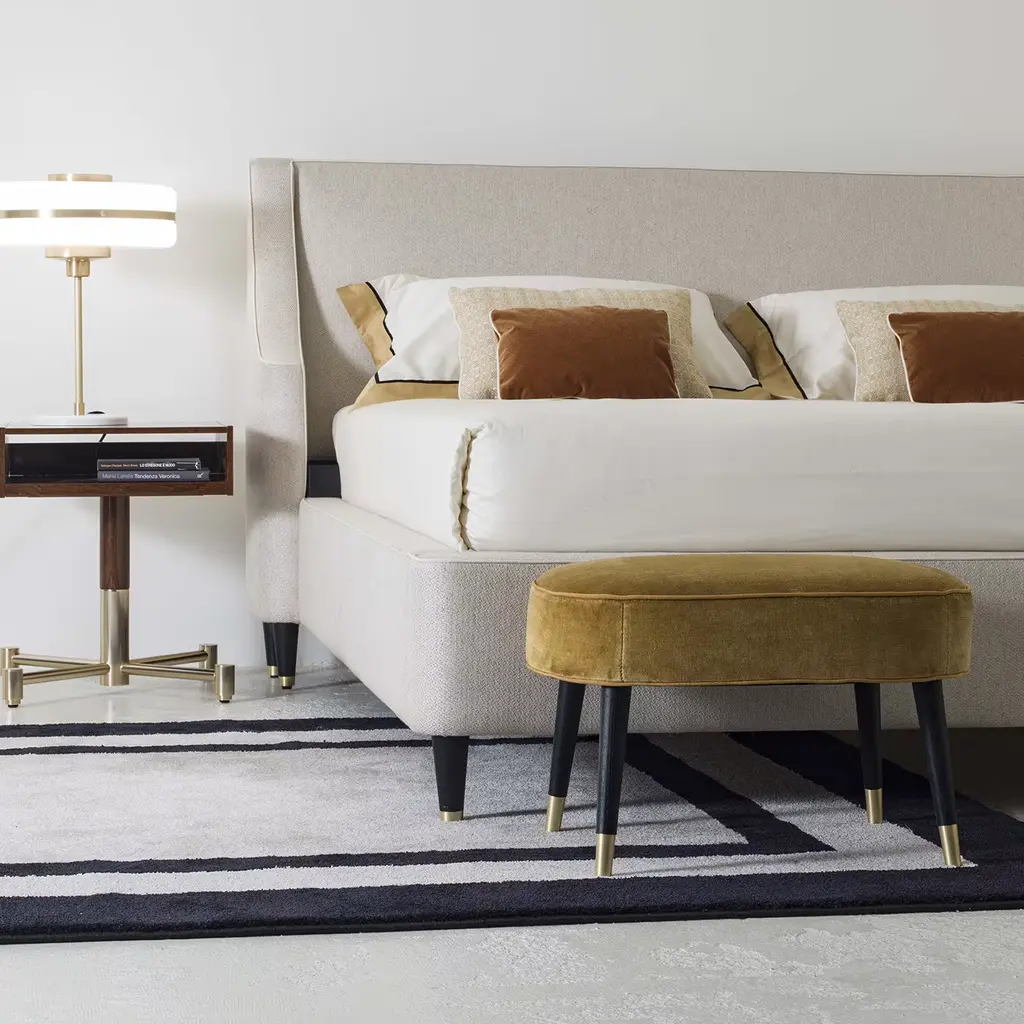 This short bench features a solid natural walnut wood or lacquered beechwood frame and legs tips in satin brass and bronze. The seat is made of plywood and is padded with high resistance polyurethane foam at variable density. The cover features a grosgrain trim and is non-removable.