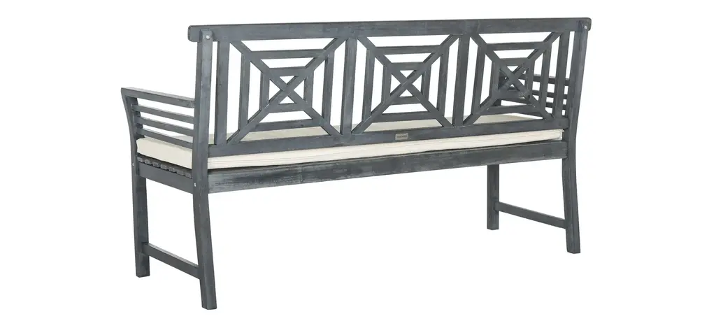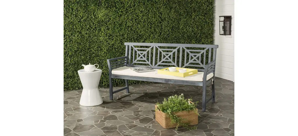 The lush tropical villas at a French Polynesian eco resort inspired this contemporary 3 seat bench. Ideal for sipping cocktails at sunset, its ash gray finish, plush beige cushion and silver metal detail create its relaxed modern geometric style.