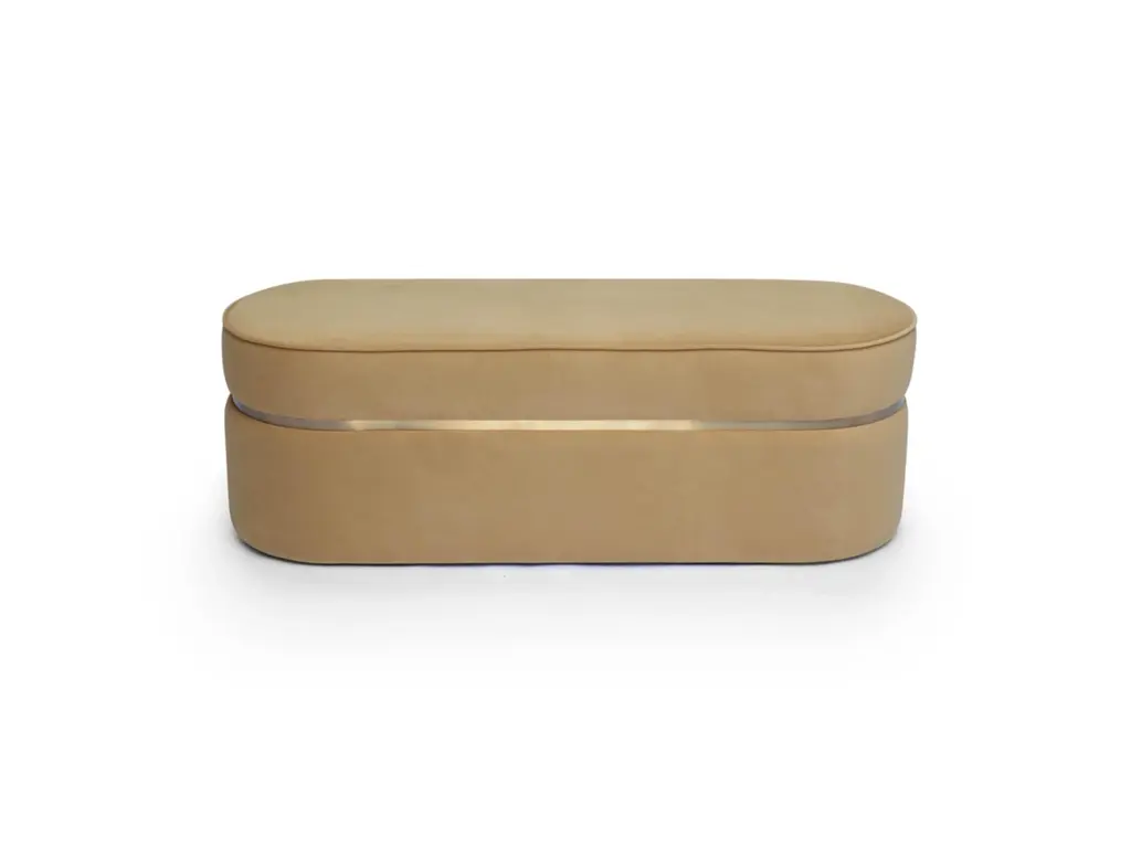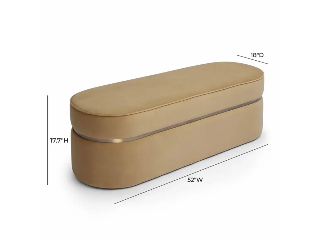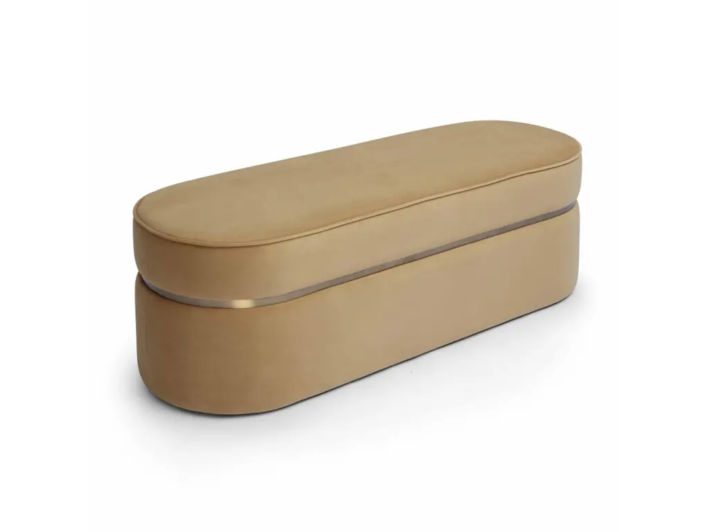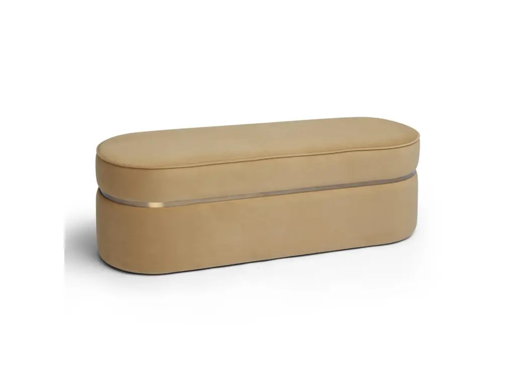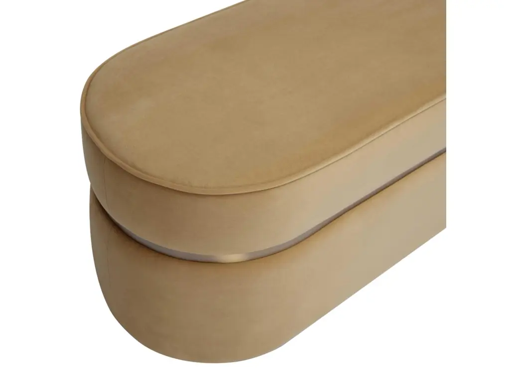 Indulge in the ultimate blend of luxury and comfort with the Pomp Velvet Bench, available in cream or honey, featuring high-density foam on top for a relaxing seating experience. A thin, gold stainless steel strip runs gracefully down the middle, adding an art deco touch that exudes understated glamour. Elevate any room's aesthetic with this timeless piece that's so in vogue right now.