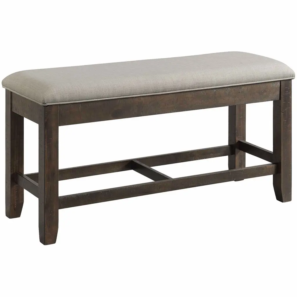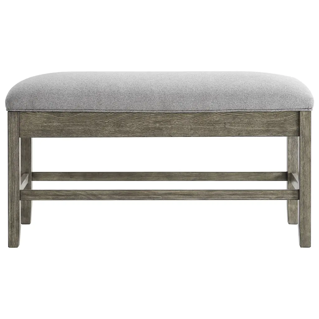 Turn heads with this stylish counter height bench, as the Ash-Gray fabric works with the Driftwood finish to create a warm and welcoming tone.