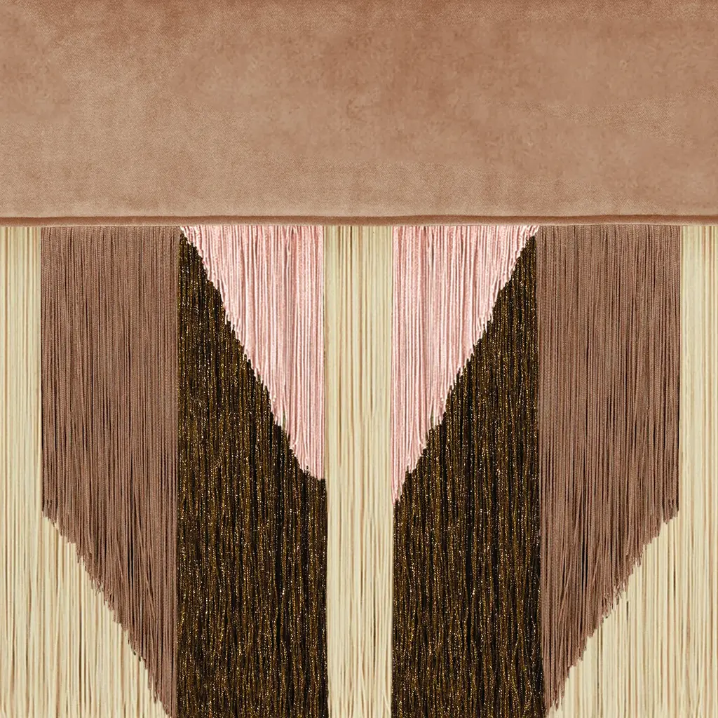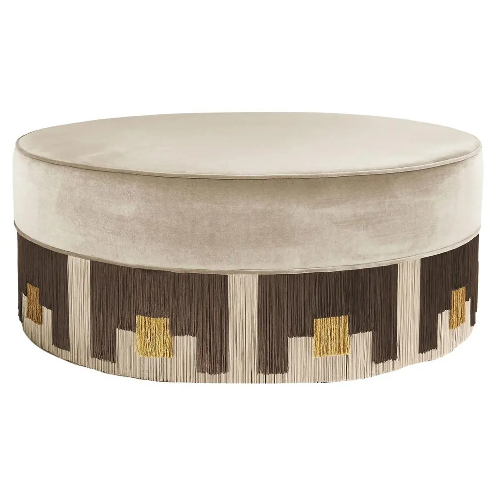 The Treasure Tribe Bench from Lorenza Bozzoli is a sophisticated addition to any space, blending modern design with artisanal craftsmanship. Its oval shape features a plush upholstered seat complemented by a distinctive fringe skirt inspired by native art, crafted from viscose and lurex. Each bench is meticulously handmade, signed, and numbered by the artist, ensuring a unique statement piece that elevates both commercial and residential interiors with refined elegance. Highlights