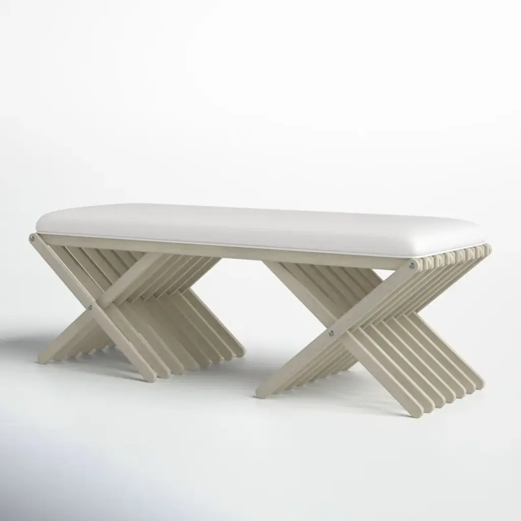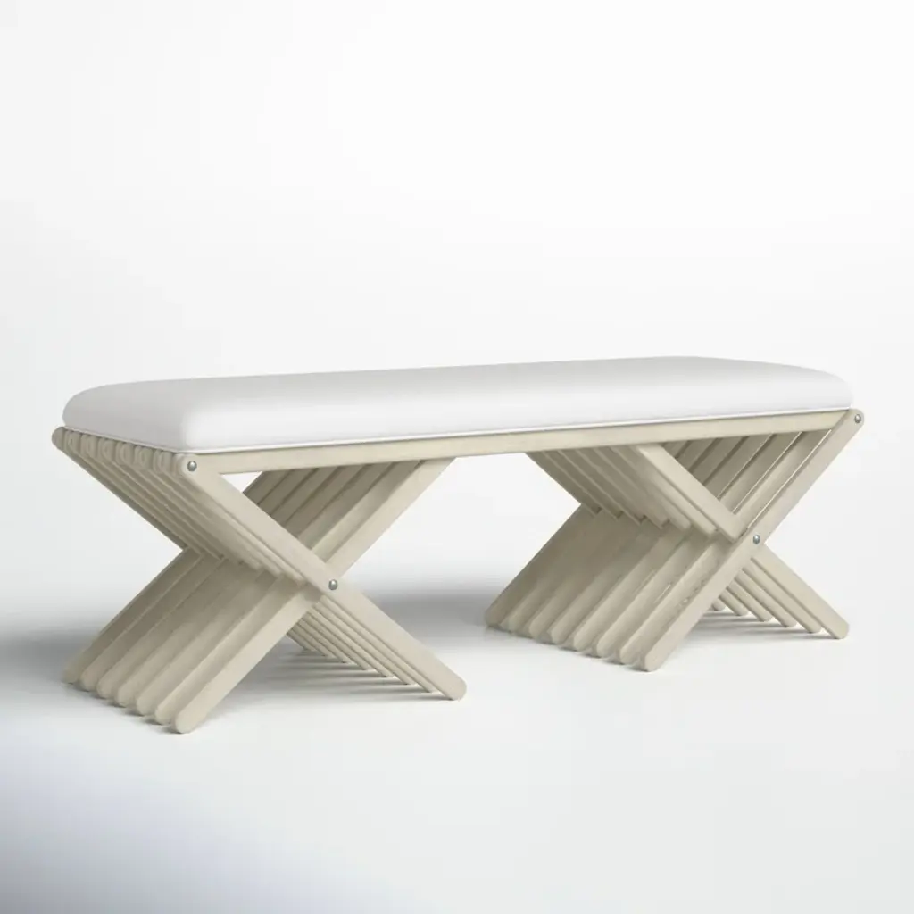 Seating makes a statement with this double bench, blending bold modern geometry with organic textures that soften the look with vintage-inspired style. A striking slatted base in a double-X design supports a finely tailored upholstered seat, creating a piece that stands out anywhere from the living room to the bedroom.