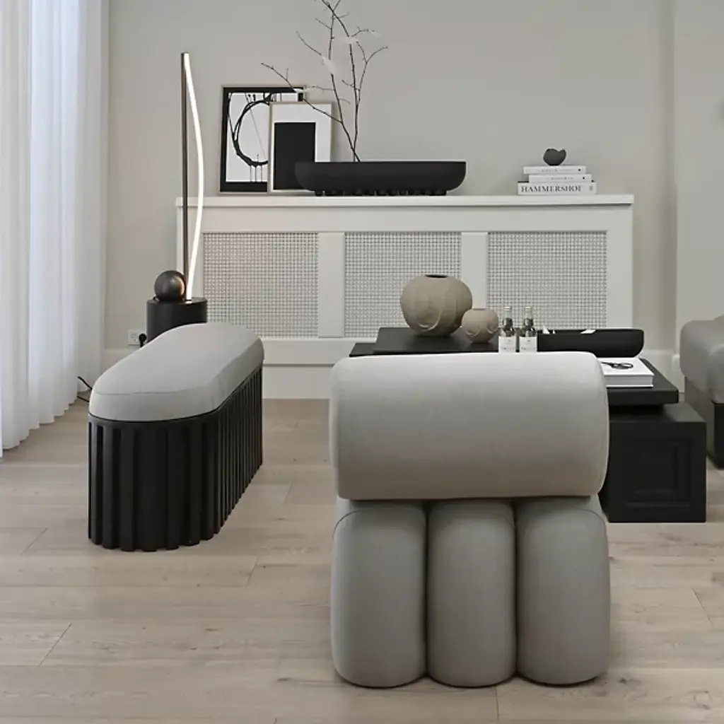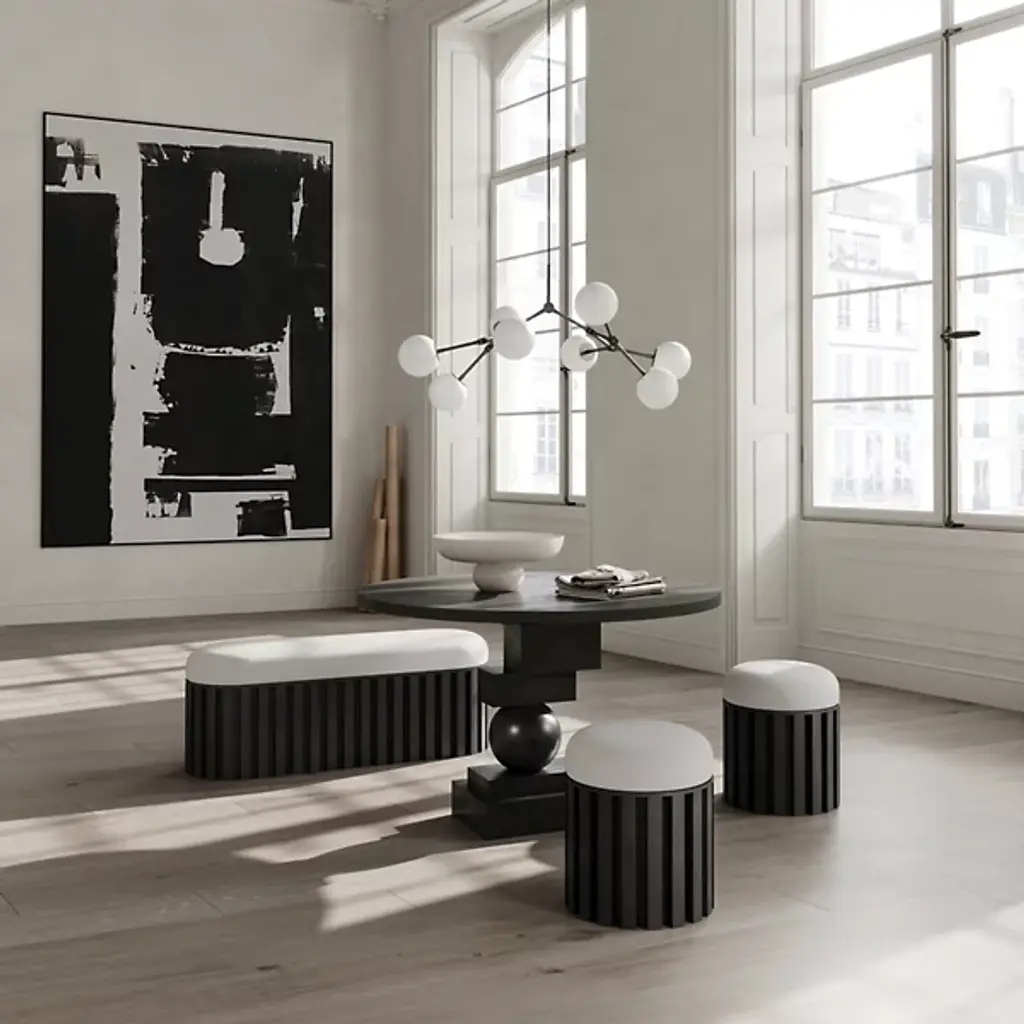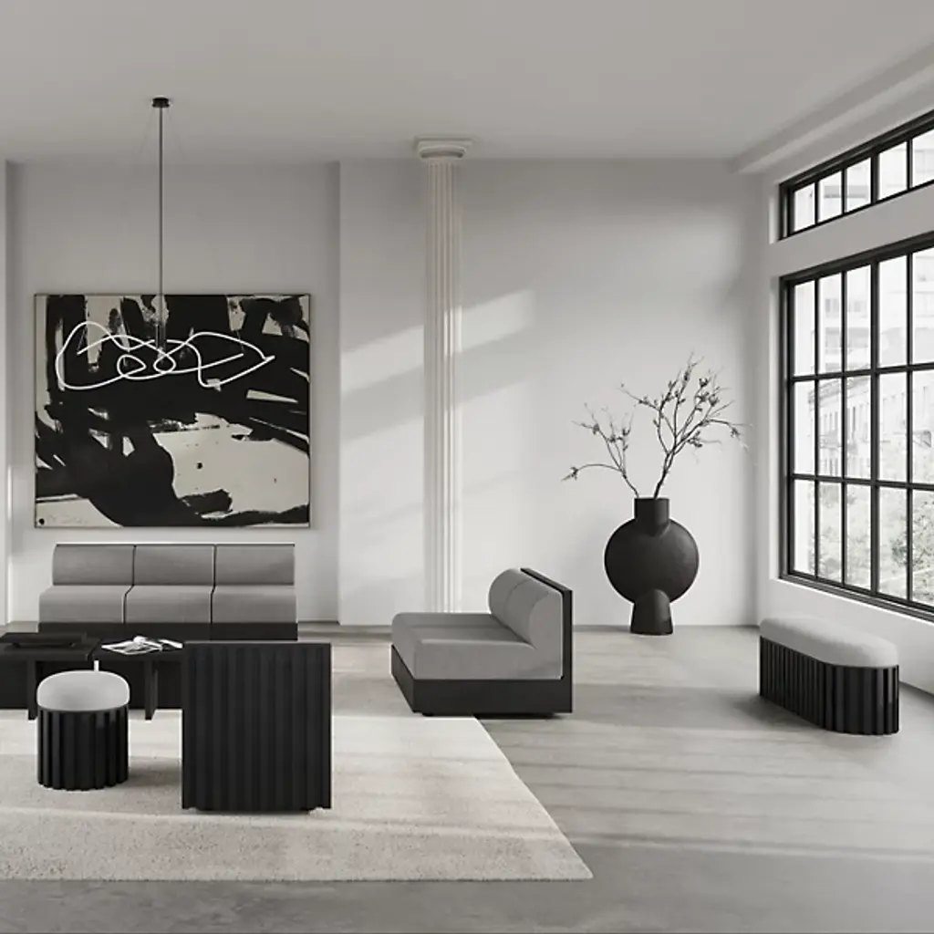 The Tribu Bench from 101 Copenhagen is a sophisticated contemporary design that blends architectural sophistication with tribal inspiration. Designed by Kristian Sofus Hansen & Tommy Hyldahl, its robust fiber concrete base anchors a plush upholstered cushion, balancing sharp, geometric lines with soft, comfortable seating. The unique concrete accents and hand-painted surface add character to its artistic flair. Great for accenting a lounge area or living space, it features mounting brackets for easy assembly and is acceptable for indoor and outdoor settings.