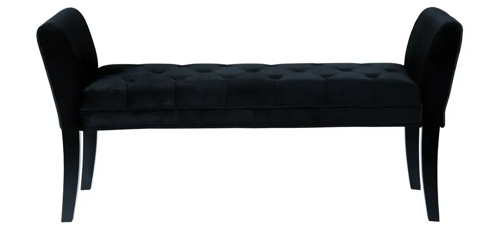 Add glamour and comfort to a bedroom, living room or hall with this sculptural tufted bench that appears to float in a room on clear acrylic legs. Artfully upholstered in lustrous black velvet, it adds a touch of style to transitional rooms. To prevent overall soiling, frequent vacuum light brushing is recommended. Cushions and pillows should be turned on a weekly basis. Down-filled cushions should be brushed rather than vacuumed. Spot clean, using a mild water-free solvent or dry cleaning product. Only a professional cleaner should undertake a complete overall cleaning. The use of steam or water-based cleaners may cause excessive shrinking or staining.