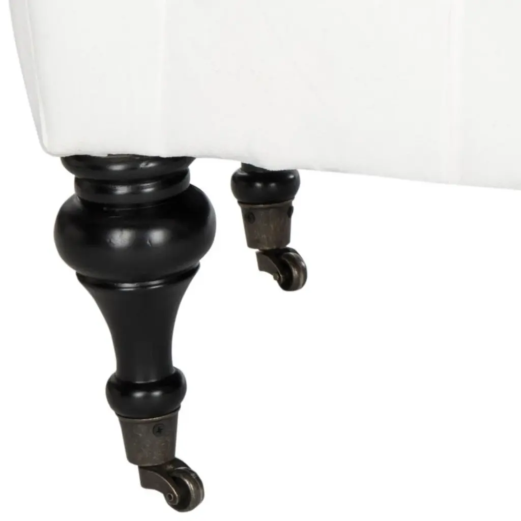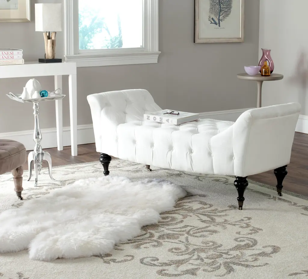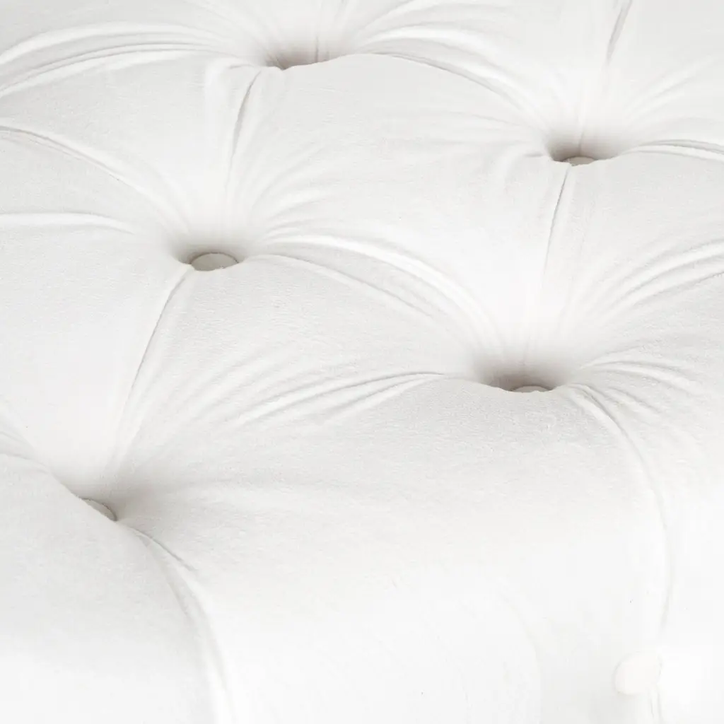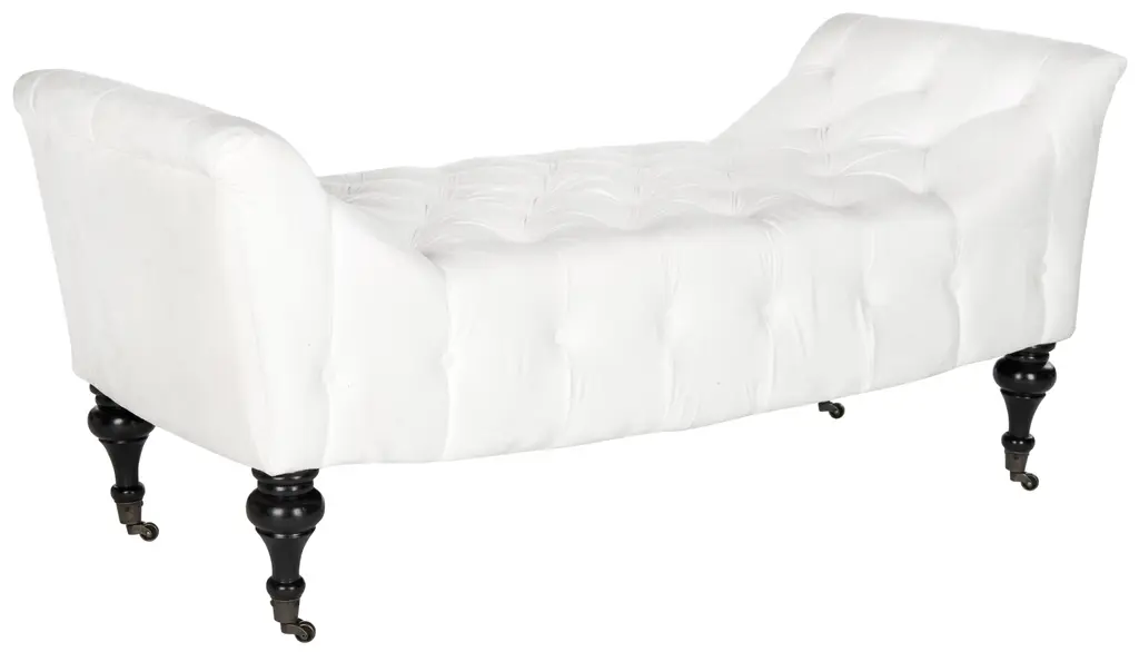 Return to the age of glamour with the white velvet slipper bench by . Lavishly quilted with button tufting, it’s crafted with turned birch legs in a rich espresso finish and on casters for easy elegance in the bedroom or living room. To prevent overall soiling, frequent vacuum light brushing is recommended. Cushions and pillows should be turned on a weekly basis. Down-filled cushions should be brushed rather than vacuumed. Spot clean, using a mild water-free solvent or dry cleaning product. Only a professional cleaner should undertake a complete overall cleaning. The use of steam or water-based cleaners may cause excessive shrinking or staining. Some assembly required.
