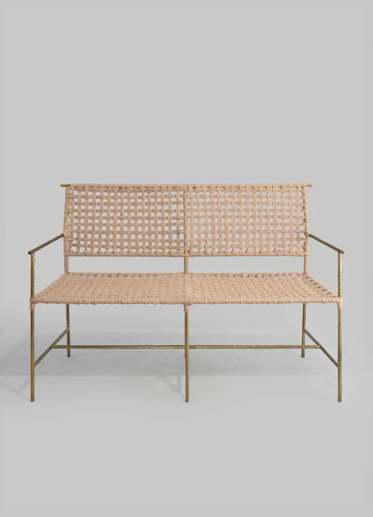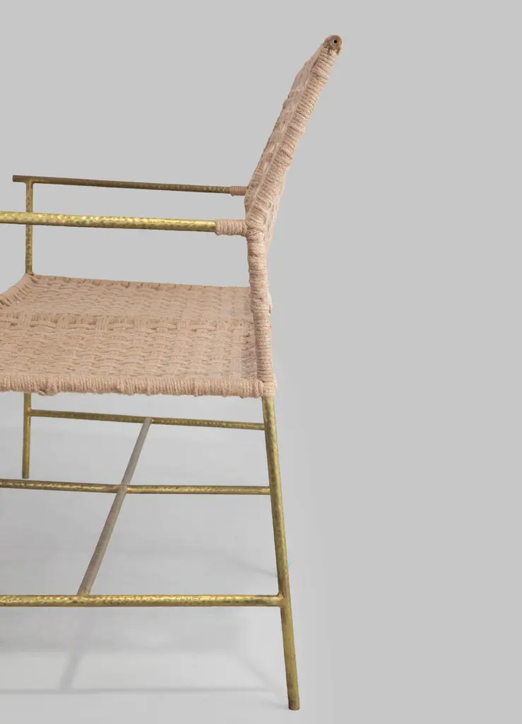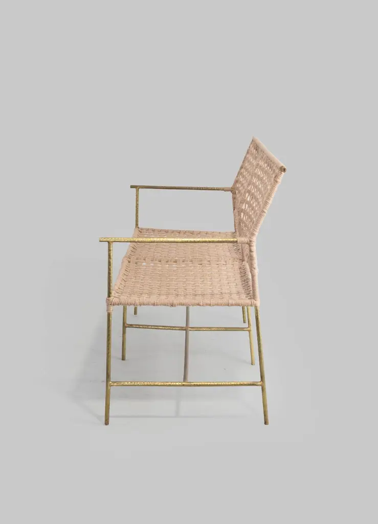 Twist & Knot Bench in Rope with Brass Legs, Viya by Vikram GoyalImmersed in the heritage of India's ancient artistry, the humble rope transports us to the heart of craftsmanship. Drawing inspiration from the ubiquitous Charpoy, a traditional Indian cot, this collection features furniture intricately intertwined using traditional knotting techniques passed down through generations. The use of organic fibers like jute and coir echoes the sustainability deeply ingrained in India's cultural ethos, and its delicate strands, fortified through interlacing, remind us that we are all stronger together.Bench in brass and cotton rope. Handmade in India.Product DetailsMaterial: Brass, MS & JuteSize: 34"L x 51"W x 22"H 86.4 L x 129.5 W x 55.9 H cmWeight: 13 kg 28.6 lbsNumber of Pieces: 1 BenchSKU: VBN101This product has been handcrafted by local artisans. As such, slight variations are a testament to the unique character of a piece made by hand.
