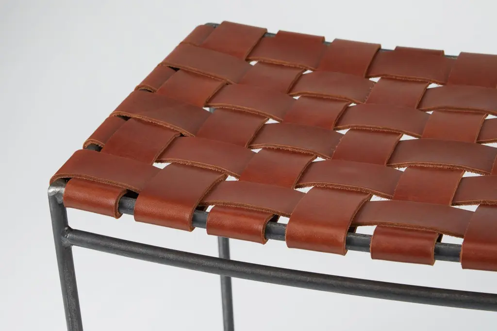 Two Seat Single Rail Handwoven Cognac Leather Bench
