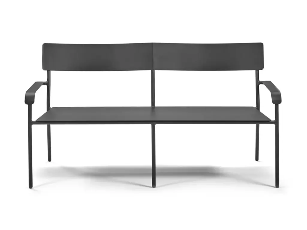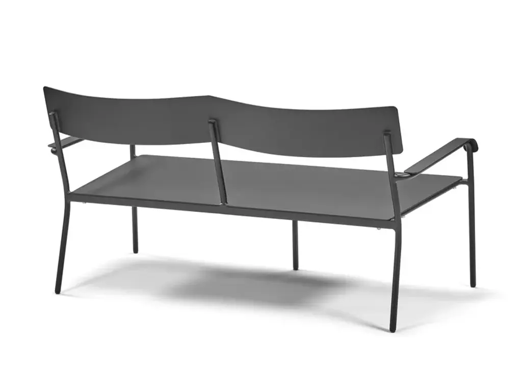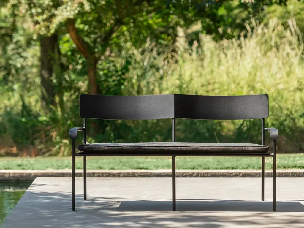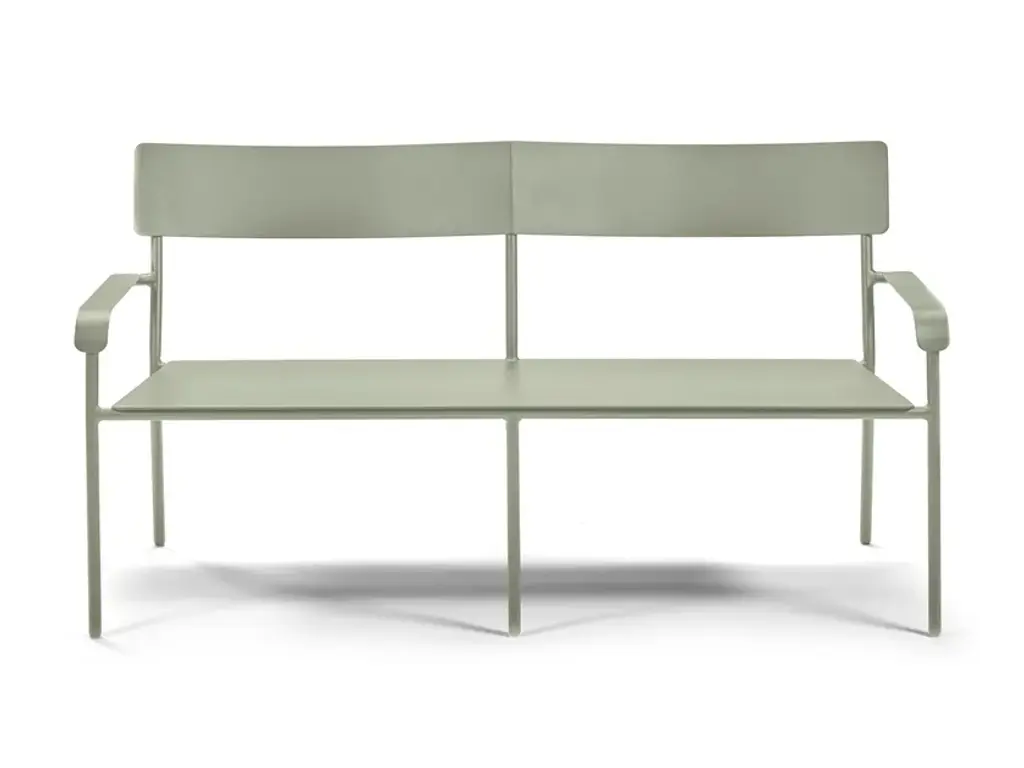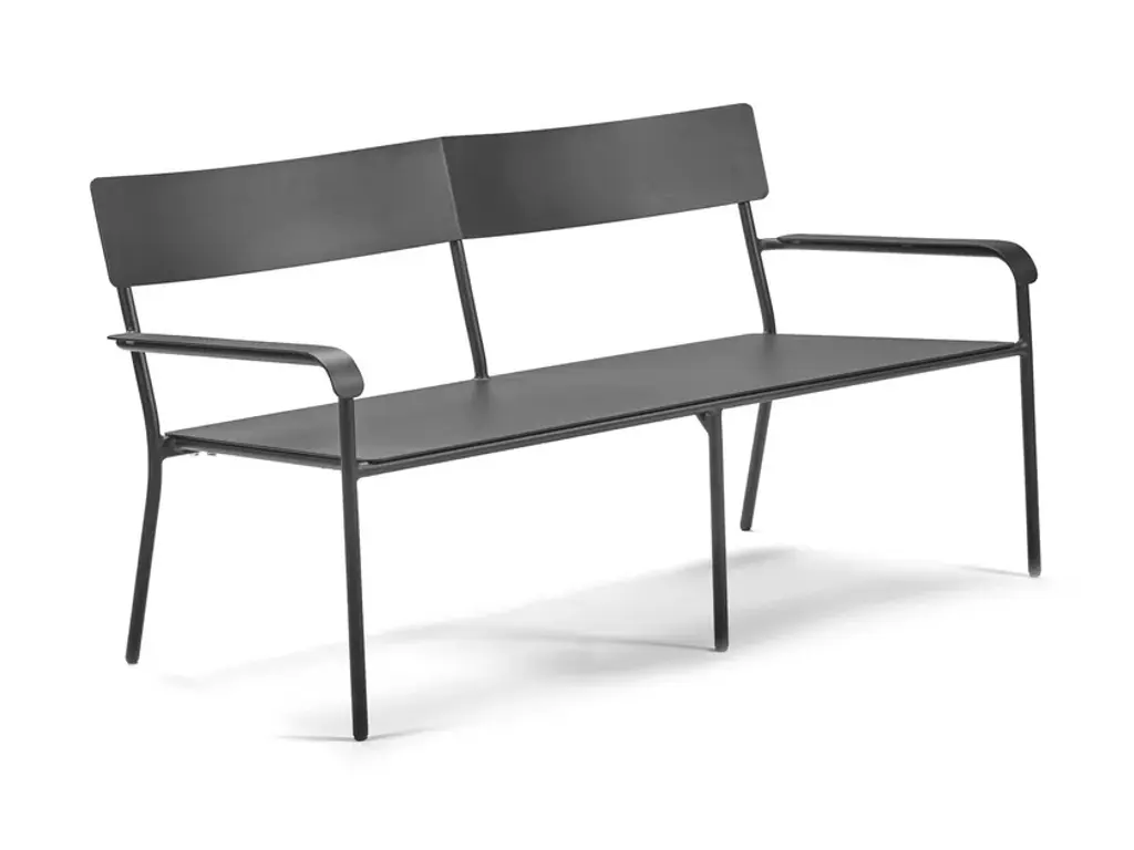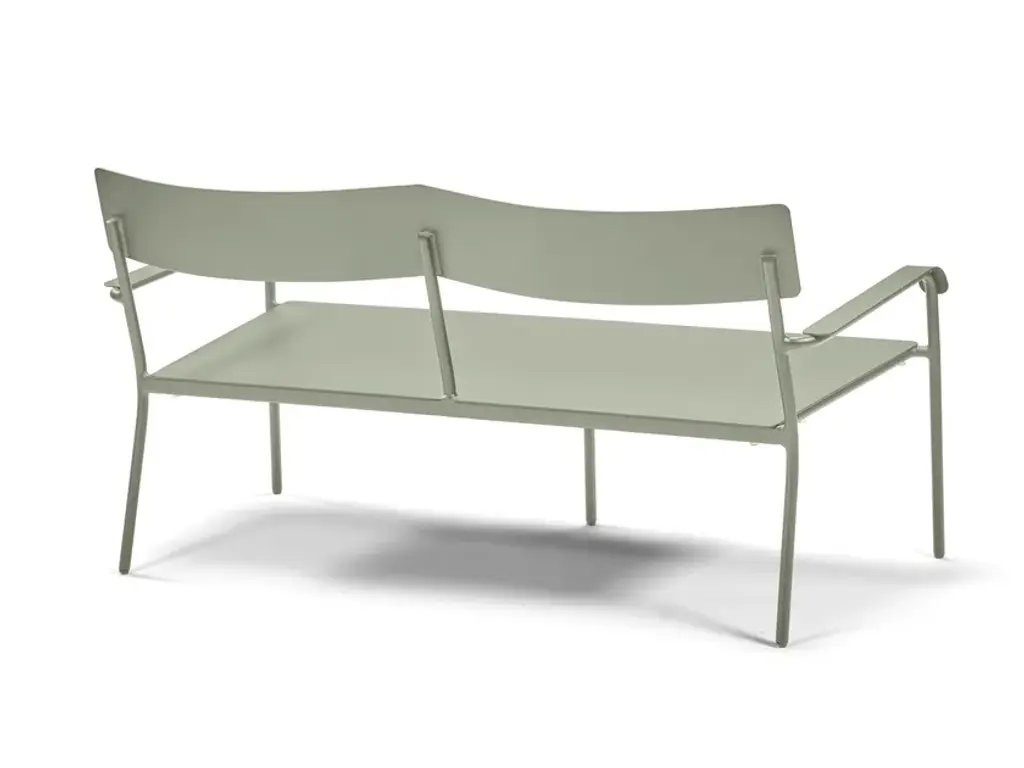 Two seater August is an aluminum outdoor bench with armrests.The August collection by Vincent Van Duysen for Serax is made of aluminium and it is available with a black, white or eucalyptus green powder coating. This makes it suitable for both indoor and outdoor use. The chairs, stools, benches and tables articulate the sheer simplicity of the monastic life they were inspired by. With a vision that results from an unbridled curiosity, Vincent Van Duysen always creates an all-inclusive atmosphere in which he seamlessly interweaves architecture, interior design, and design objects. A vision to which he also stayed true when he was commissioned to convert the monastery of the former military hospital in Antwerp into a hotel. For the terrace he designed the August collection, a series of minimalist chairs that effortlessly link the history of the environment to a modern interpretation. August by Vincent Van Duysen for Serax is made of powder coated aluminium, available in muted shades. This makes it suitable for both indoor and outdoor use. The chairs, lounge chairs, sun loungers, tables and stools articulate the sheer simplicity of the monastic life they were inspired by. The wider, slightly lower proportions of the lounge chairs are of this day and age and contribute to modern-day comfort.