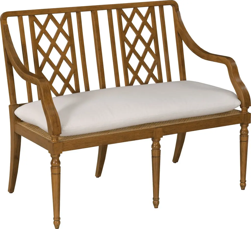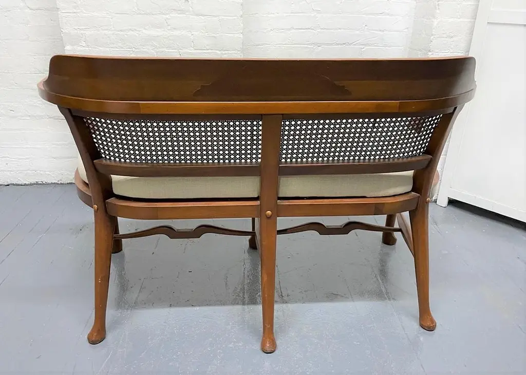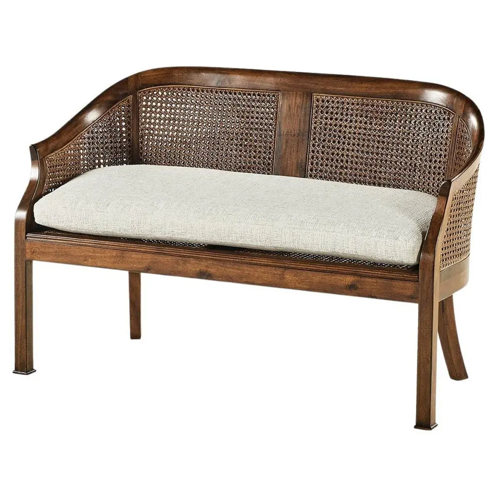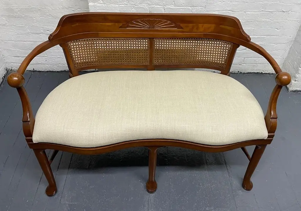 Two, Solid cherrywood Country style benches. The benches have caned backs, fabric seats and is solid Cherrywood. The arms are turned and has a solid ball to the tips of the arms.Priced individually.