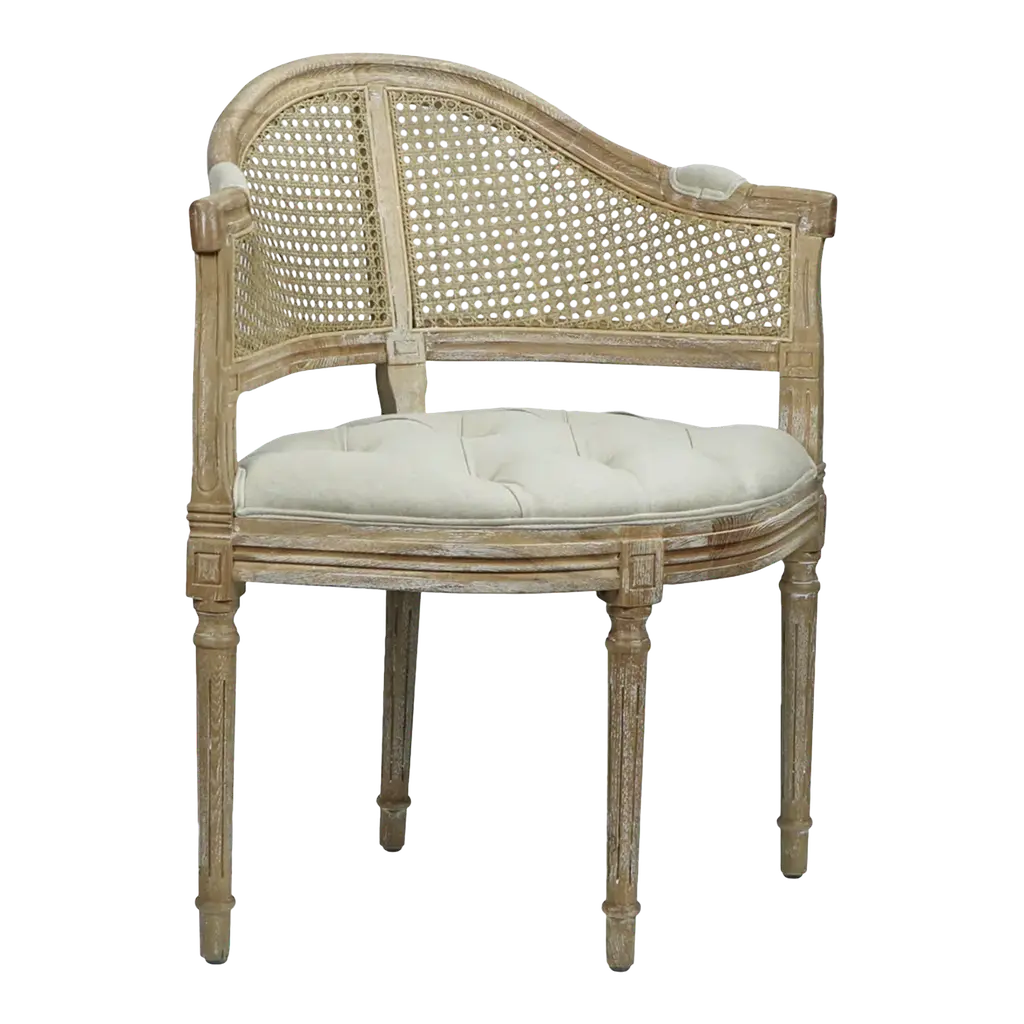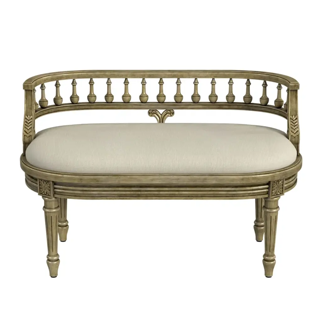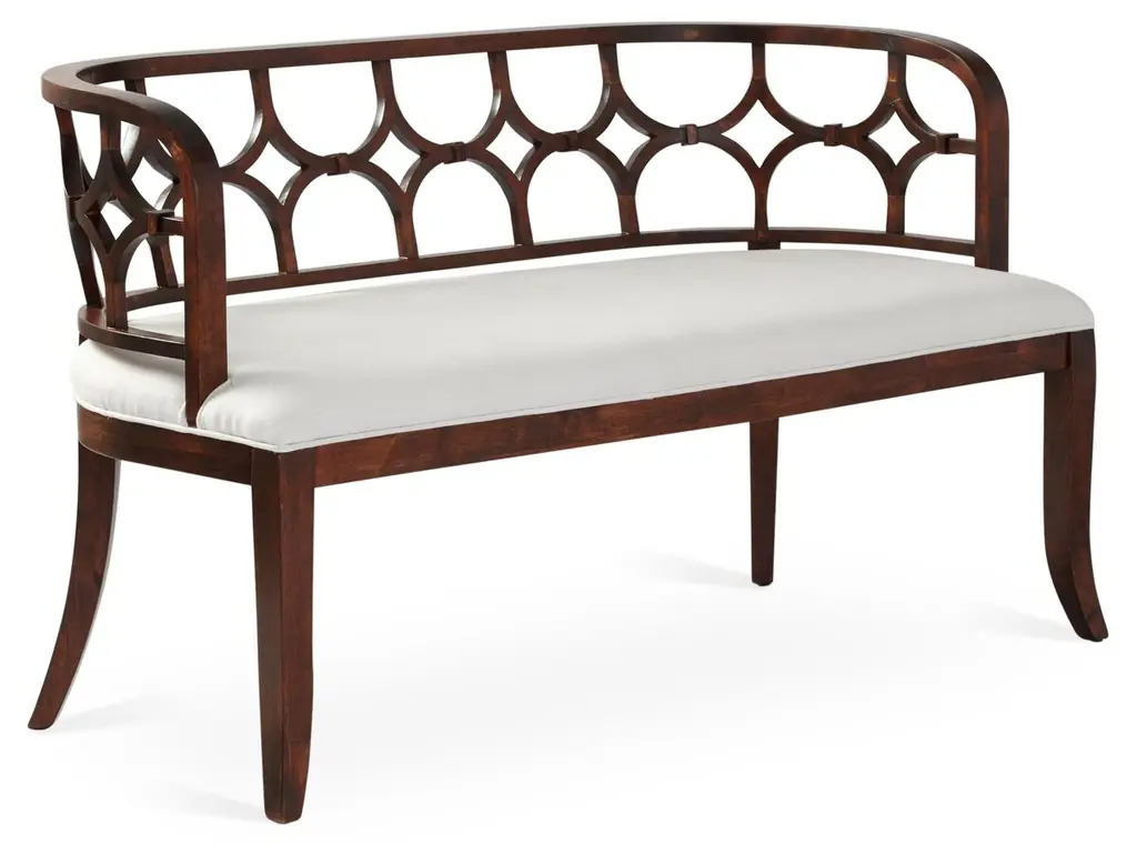 Two, Solid cherrywood Country style benches. The benches have caned backs, fabric seats and is solid Cherrywood. The arms are turned and has a solid ball to the tips of the arms.Priced individually.