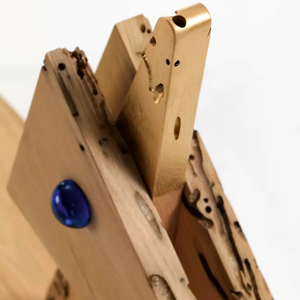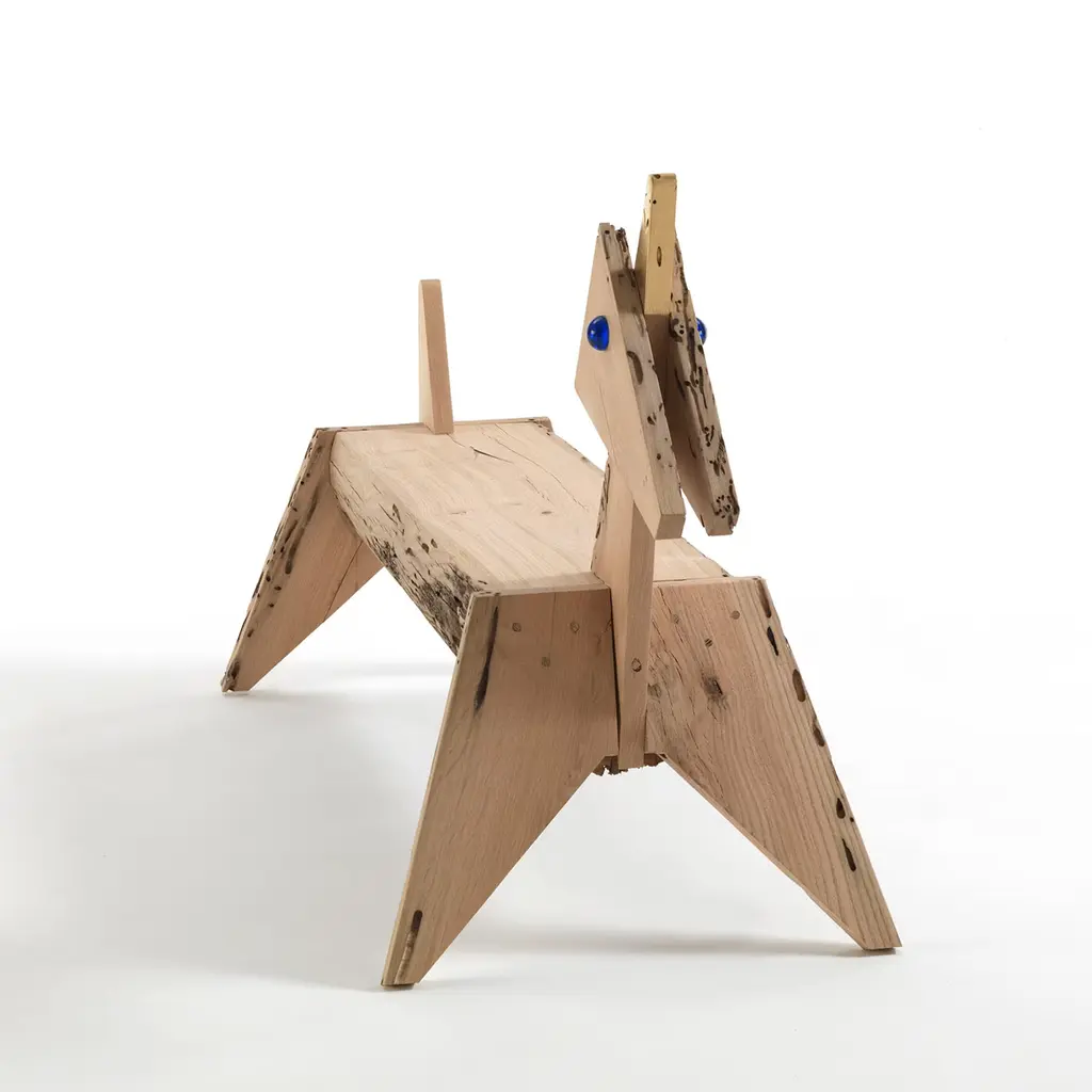 This artful unicorn-shaped bench by Alessandro Mendini reinterprets fantastic childhood toys. Crafted of briccola - from the wooden poles dotting the Venetian lagoon - the piece features unrepeatable grain and holes, completed by blue Murano glass eyes and a glamorous golden horn.