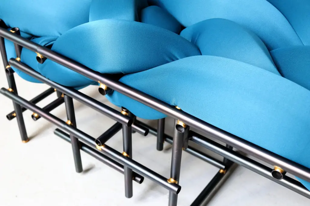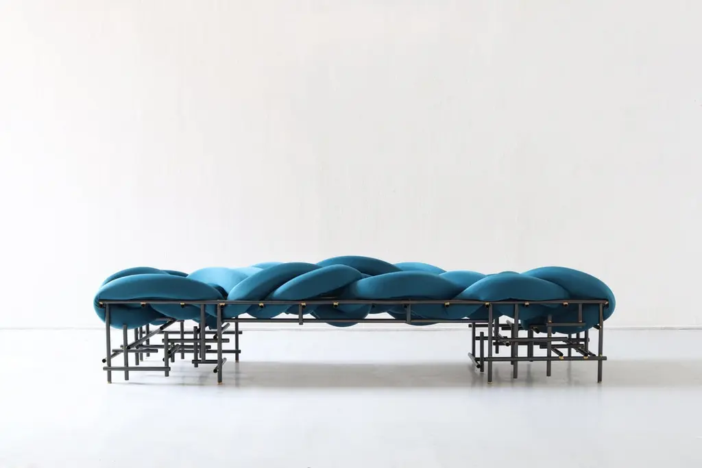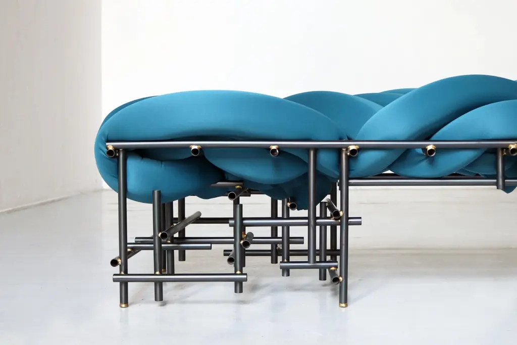 Unique long lawless bench by Evan FayEach is a unique hand-sculpted creation Dimensions:96 W, 24 D, 22 H (in inches)244 W, 60 W, 55 H (in centimeters)Materials: Steel, brass, foam, scuba knit.Lawless chair is a celebration of irregularity within a system, pursuing a more artful form that responds to the chaotic landscape within our structured society. The punk aesthetic within the chair contextualizes a poetic moment to reflect and voice through design, an attitude towards our hectically evolving environments and contemporary dilemmas. Taking ownership of truthful possessions, finding comfort in dystopia, and beauty in chaos may be a confronting reality and opportunity to embrace new expressions in design.
