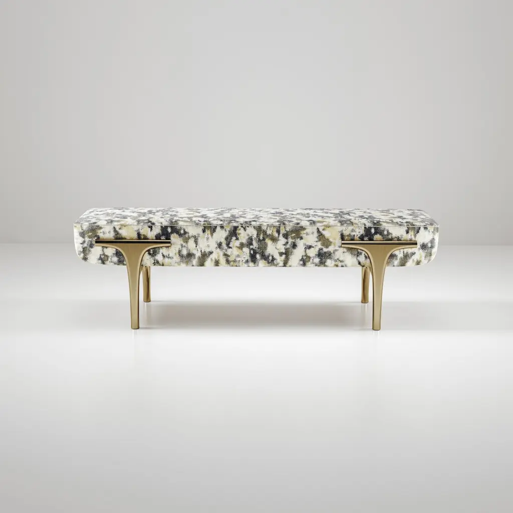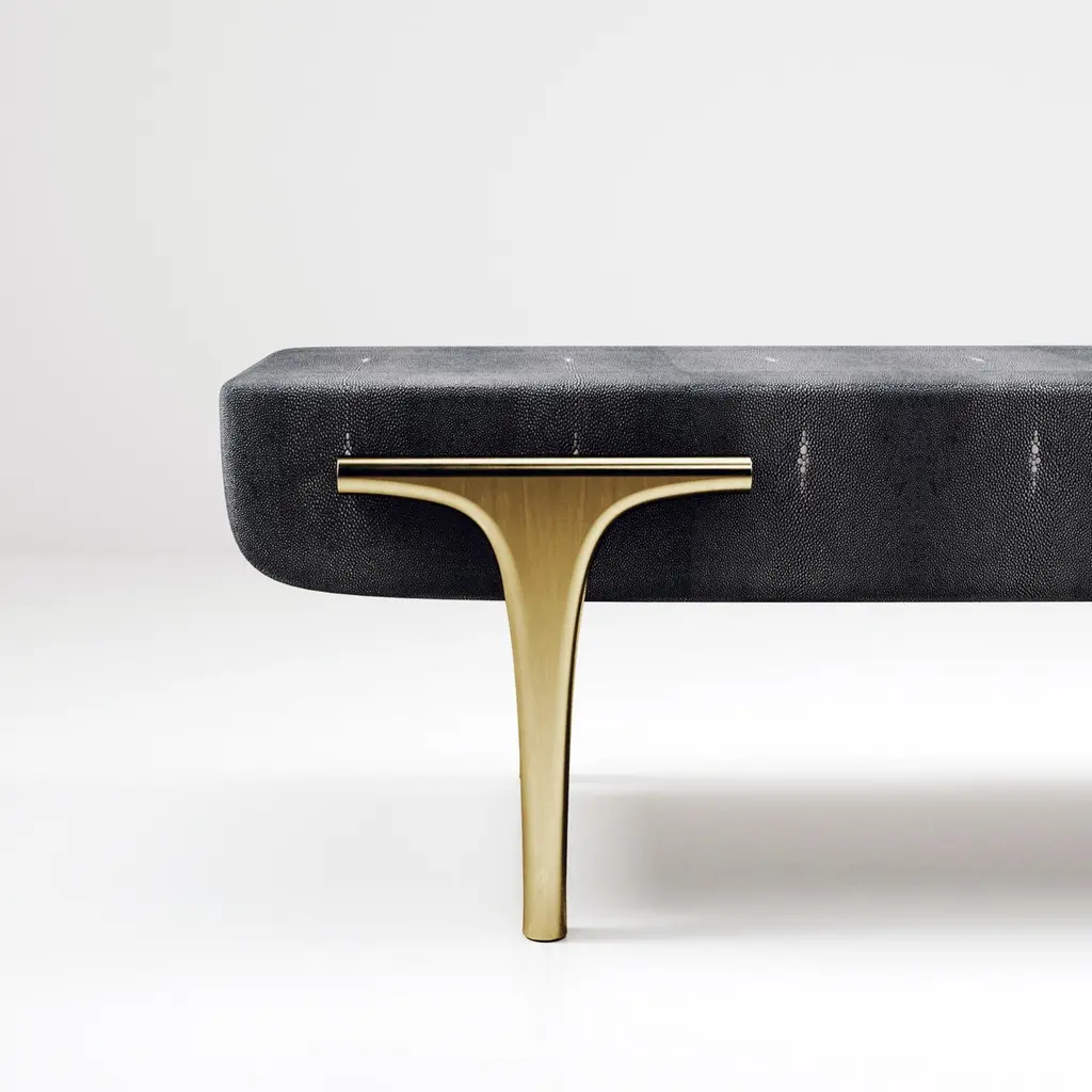 The Paris based label has distinguished themselves since their launch, with their iconic use of shagreen mixed with brass and other exotic materials. All furniture is handcrafted by skilled artisans, ultimately making each piece unique, designed in Paris and produced in the Philippines.The Ramo Bench by R & Y Augousti is an elegant and versatile piece. The upholstered piece provides comfort while retaining a unique aesthetic with the bronze-patina brass frame and details. The camouflage pattern is a Pierre Frey fabric. This listing is priced for our fabric supply, see other listings for pricing of client COM and shagreen inlay. Part of the Ramo Seating Series, see images at end of slide.The dimensions of this piece are length - 150.0 cm depth 46.0 cm height 43.0 cmAll R & Y Augousti pieces are handmade by artisans, ultimately making each piece unique.Wipe clean with soft dry cloth.Acclaimed design duo Ria & Yiouri Augousti have established themselves since the 1990s as pioneers of modern-vintage style through their luxurious Art Deco inspired collections.The Paris based label has distinguished themselves since their launch, with their iconic use of shagreen mixed with brass and other exotic materials. All furniture is handcrafted by skilled artisans, ultimately making each piece unique. All shagreen-covered items should be kept out of direct sunlight, color variants may occur on the stingray and other exotic finishes, but this showcases the Parisian label's commitment to creating authentic luxurious products using natural components.