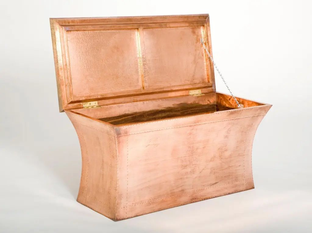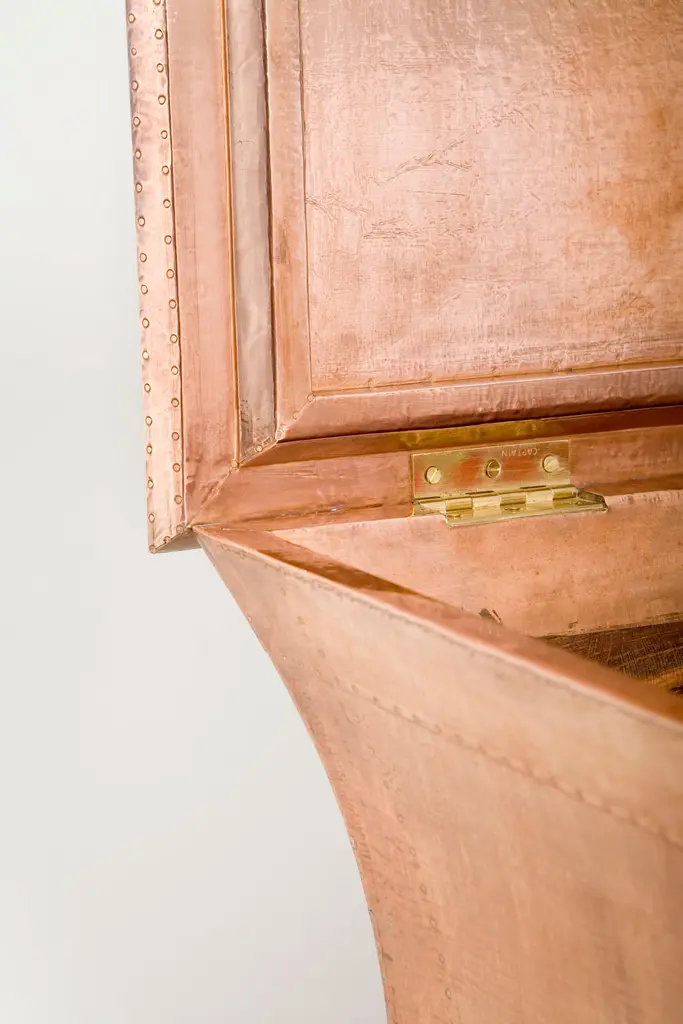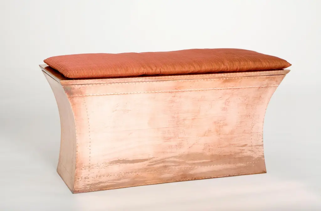 The traditional metal clad furniture he found in India inspired renowned designer Paul Mathieu to create this elegant and curvaceous storage bench. The arcing sides and top of this piece are hand carved from solid pieces of teak. The hinged lid opens to reveal a removable inset tray. Pattern makers trace and cut complex forms that will cover the bench from thick sheets of copper, brass or white bronze. Once the bench is joined together, it is meticulously encased in a tight fitting skin of white bronze, copper or brass. The metal finish will tarnish over time, but regular non-abrasive household metal polish can be used to restore the original luster. Vaisseau Bench in CopperSize- 36" x 16" x 17"HMaterials - Copper, Teak, Cast, Hand-CraftedPlease note that moisture in air, sudden change in temperature and natural movement of wood over time causes the metal to wrinkle or bubble up. We use well seasoned, reclaimed teak and high quality marine grade MDF (wherever technically possible) to avoid and delay the above mentioned changes. However a perfect stability of metal cannot be guaranteed.Buyer Cancellation-The cancellation charge is 25% which increases to 50% if the production is started.Prices do not include shipping from India (for custom orders) or our MN warehouse (items from stock). That will be additional.