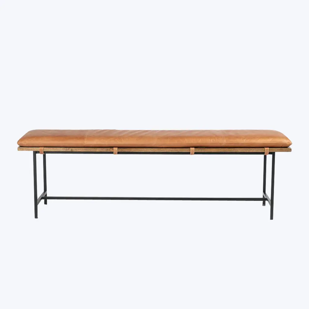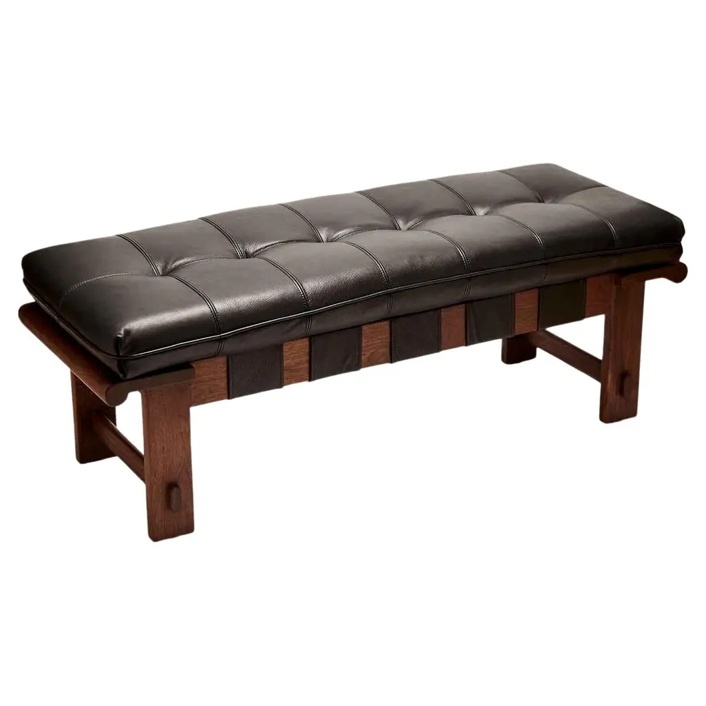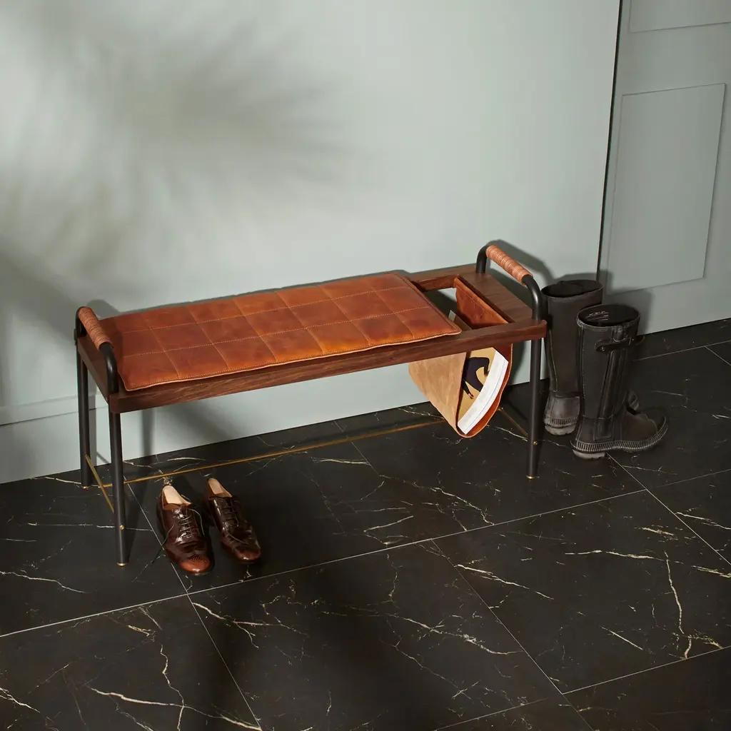 Known for his interiors and set designs, David Rockwell imbues Valet Seated Bench with a forthright but luxe personality. The elements are all precise: a blackened steel frame, American walnut bench and a sumptuous quilted saddle-leather cushion. A cutout on one side of the bench accommodates a leather sling pocket for magazines or sundries. And leather-cord wrapped handles and brass detailing add a refined finish.