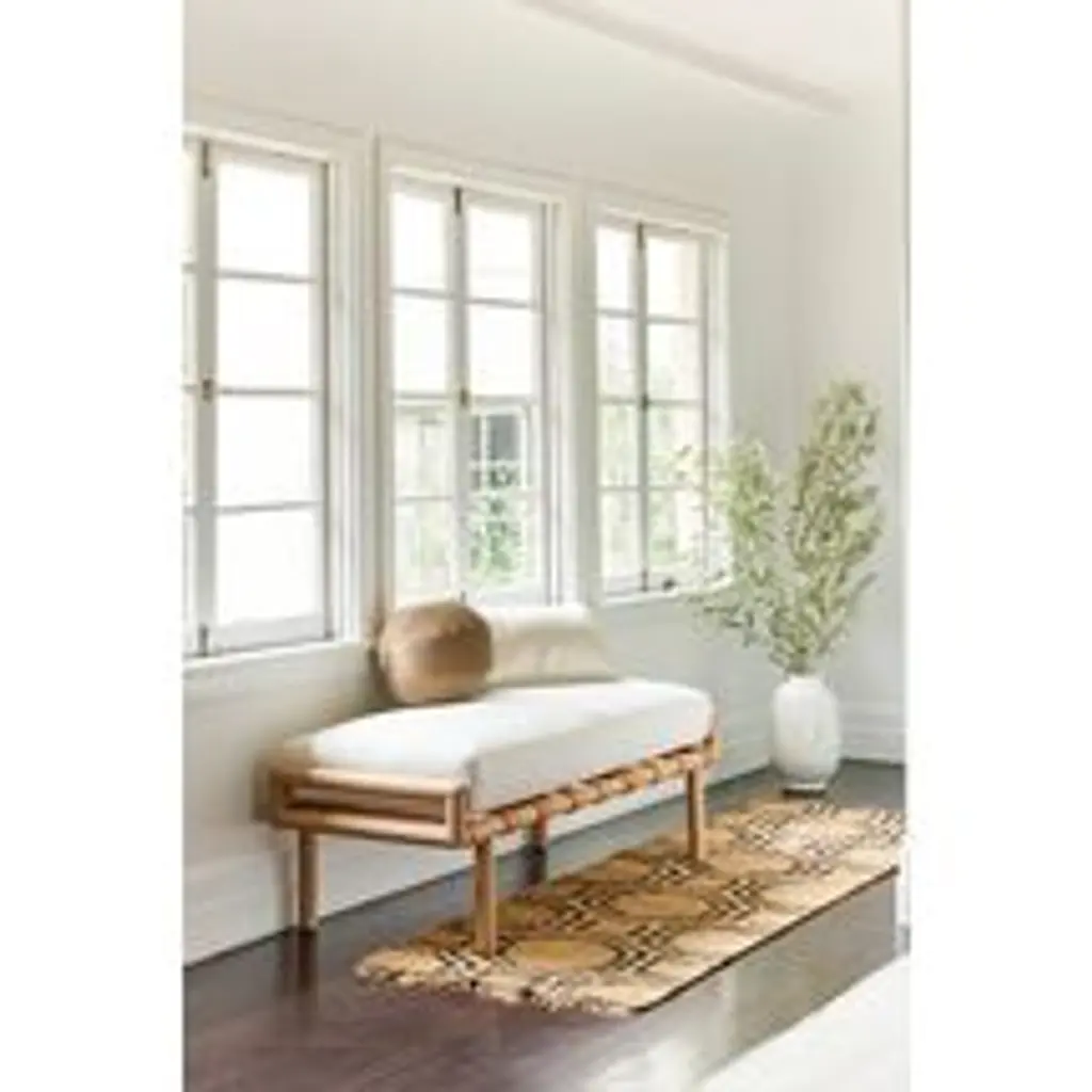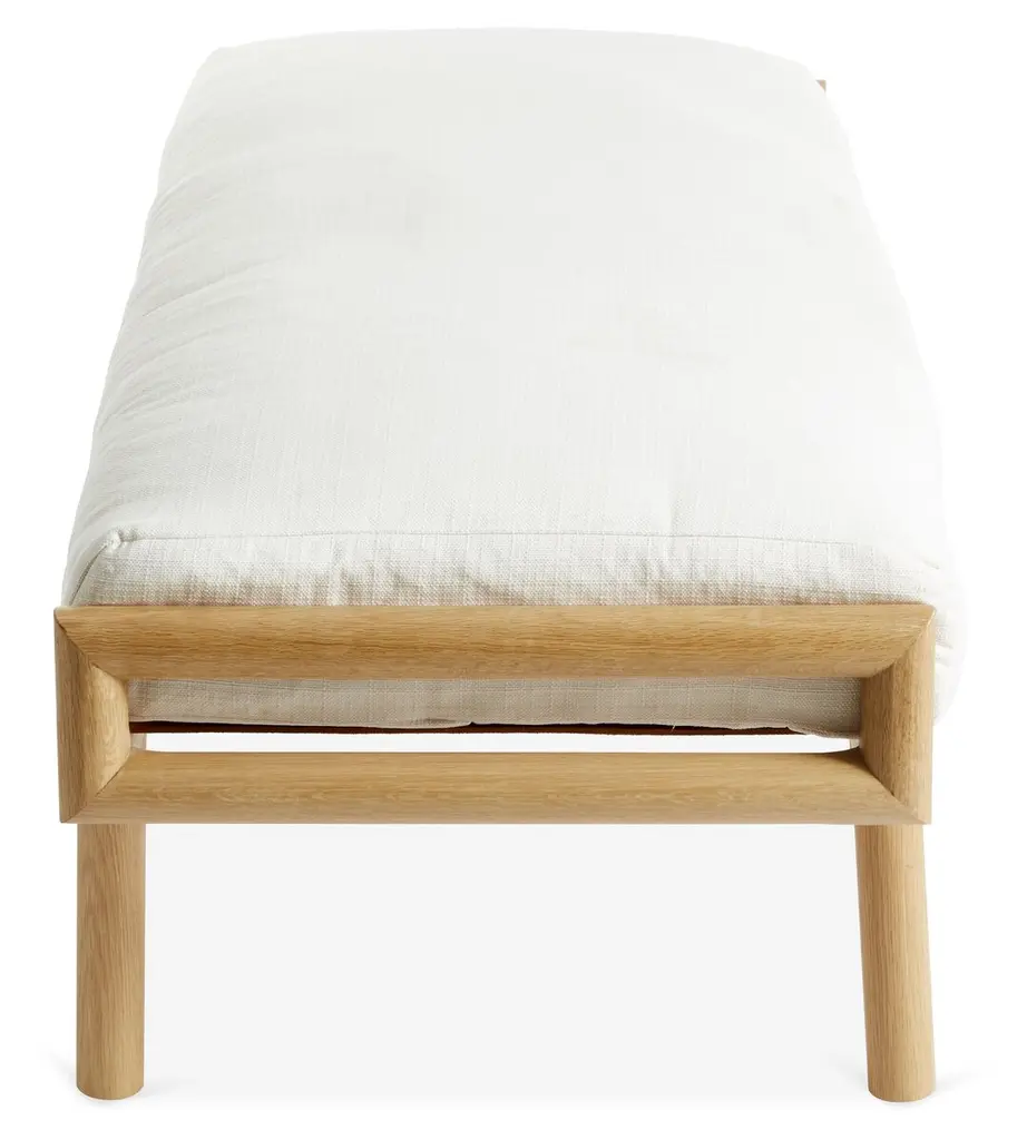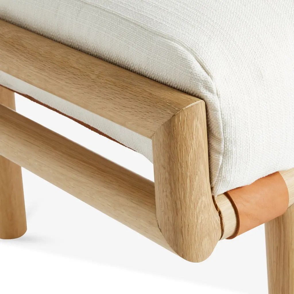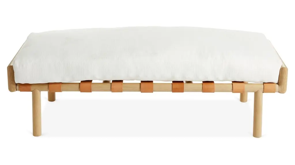A stylish addition to the entryway or at the foot of the bed, this bench is perched on an elevated oak base with leather straps and a seat cushion upholstered in Crypton--an eco-friendly high-performance fabric that repels stains, spills, bacteria, and mold. As comfortable as it is stylish, this piece is generously filled with down and feathers.