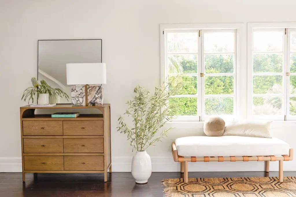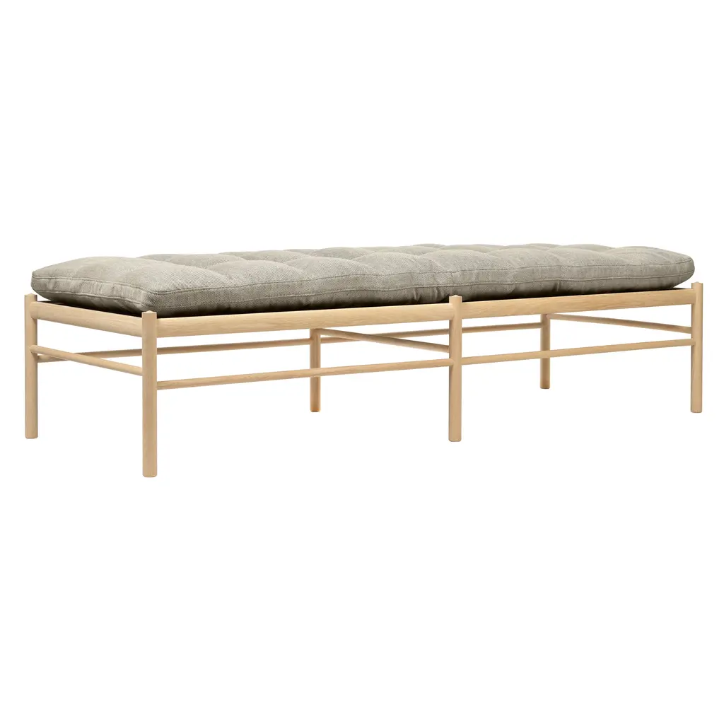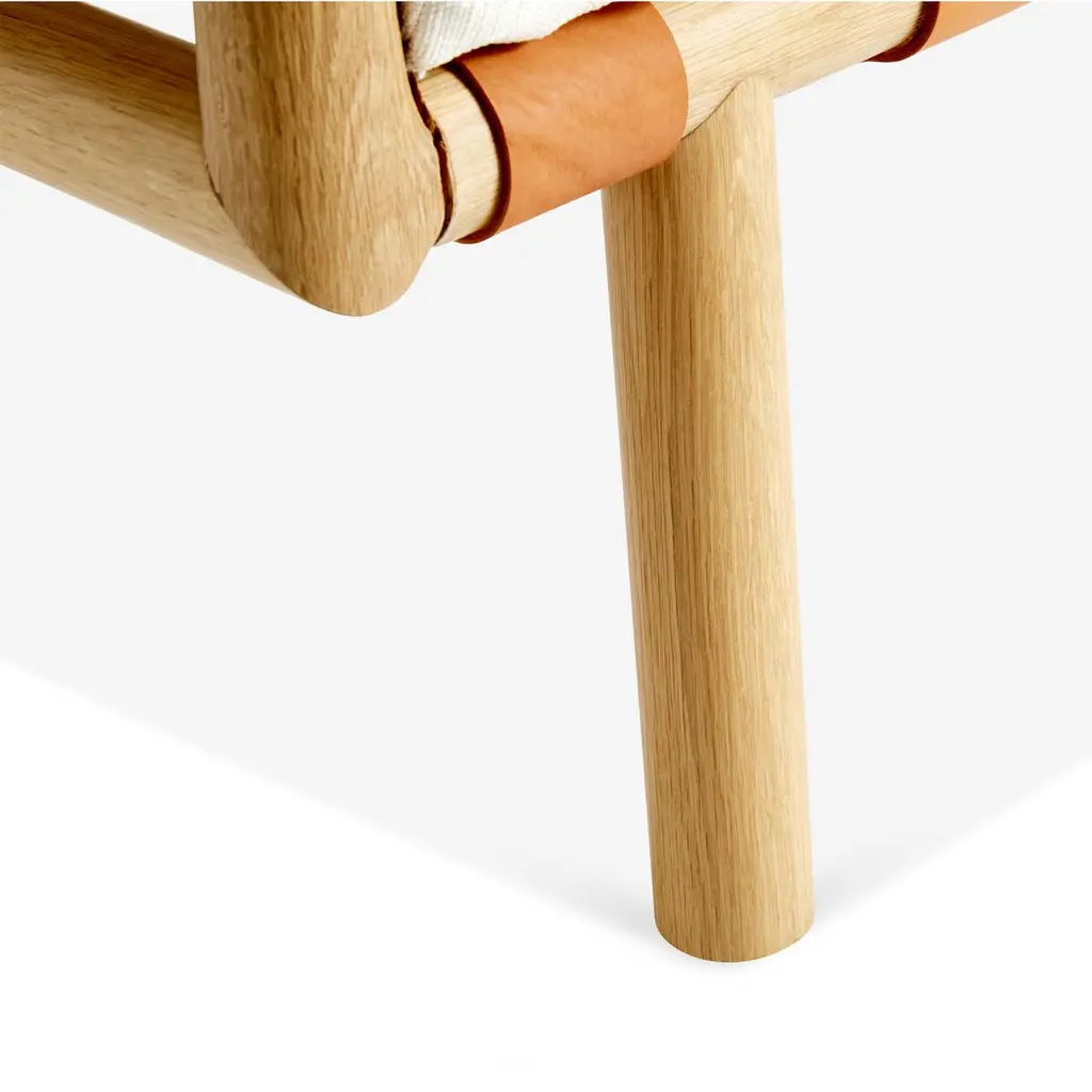 A stylish addition to the entryway or at the foot of the bed, this bench is perched on an elevated oak base with leather straps and a seat cushion upholstered in Crypton--an eco-friendly high-performance fabric that repels stains, spills, bacteria, and mold. As comfortable as it is stylish, this piece is generously filled with down and feathers.