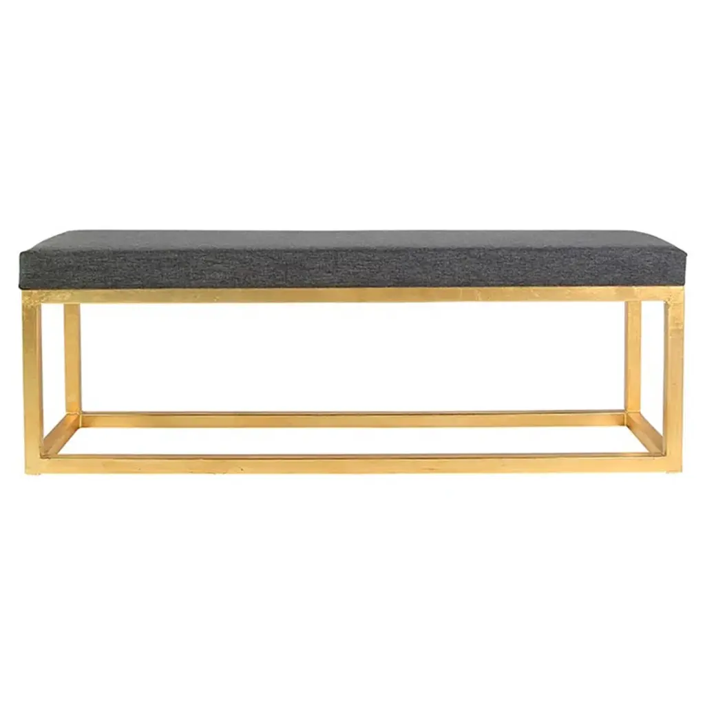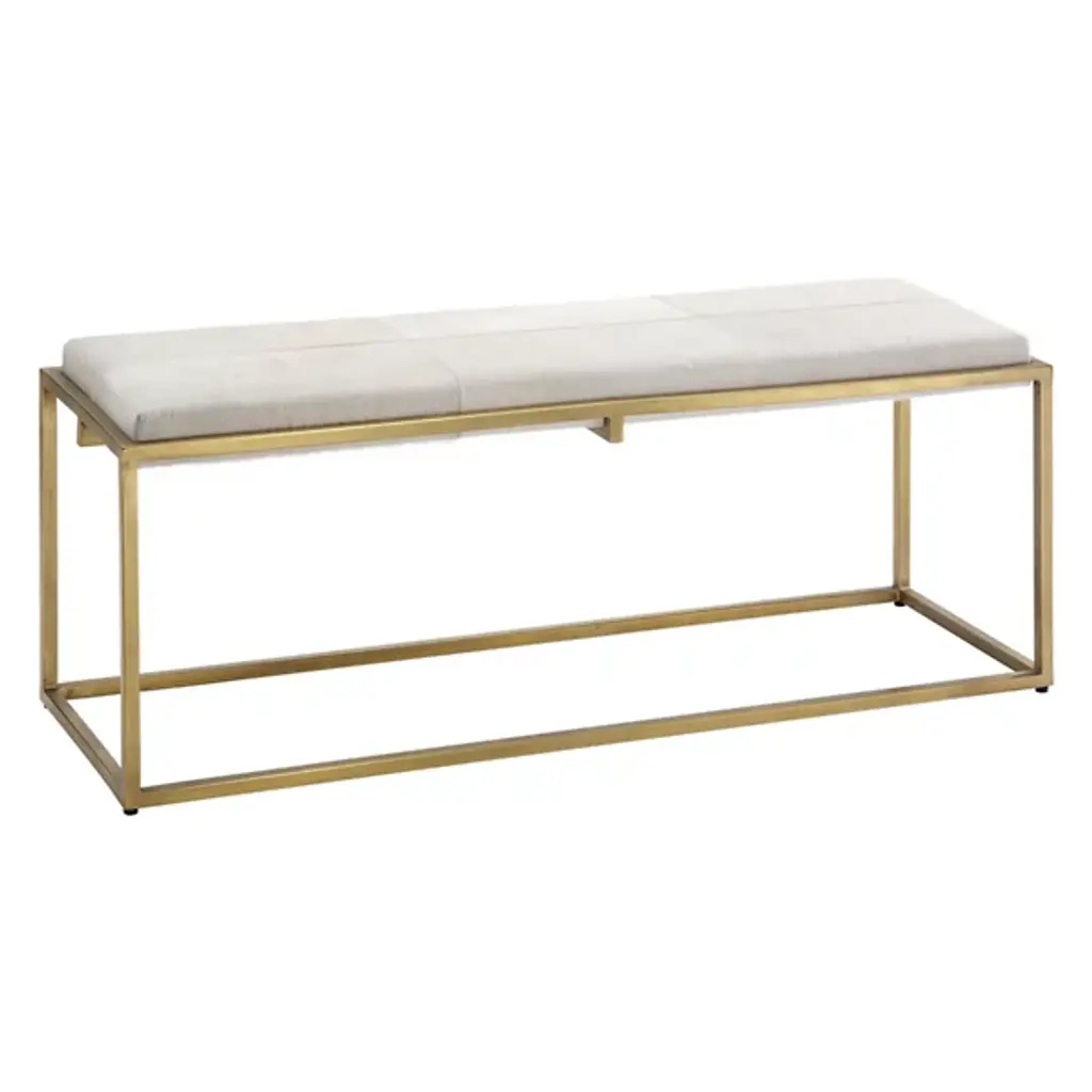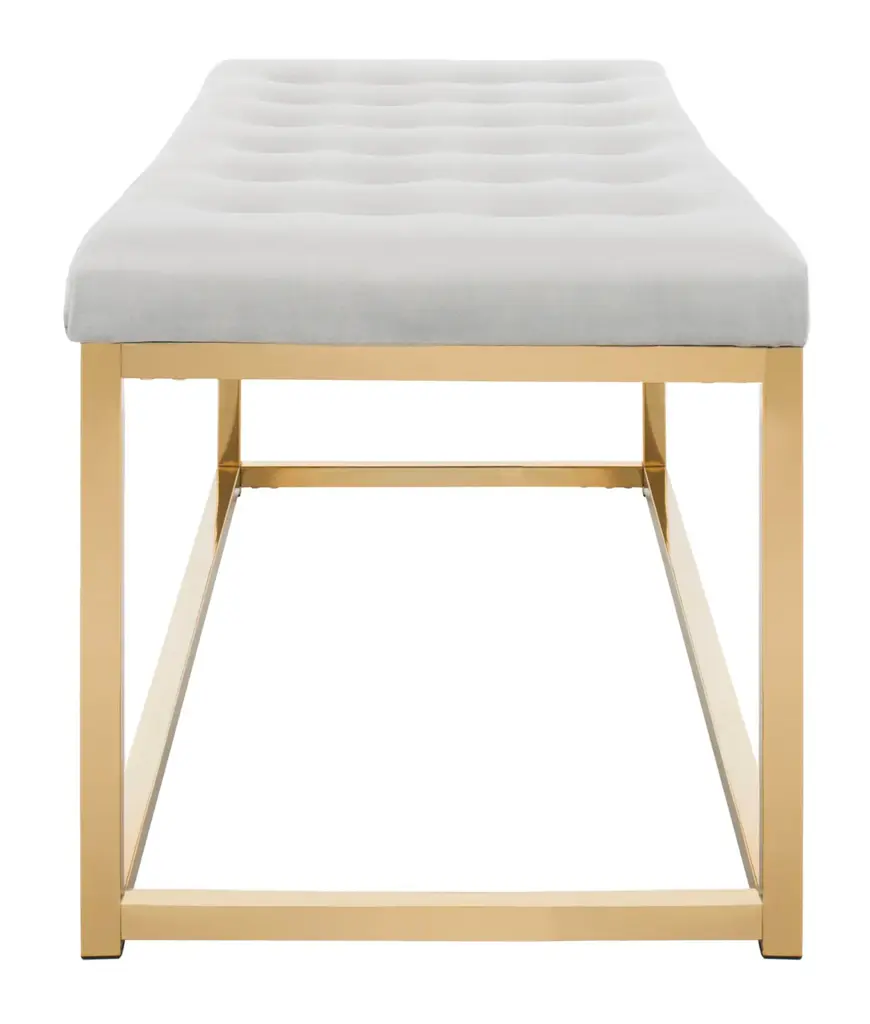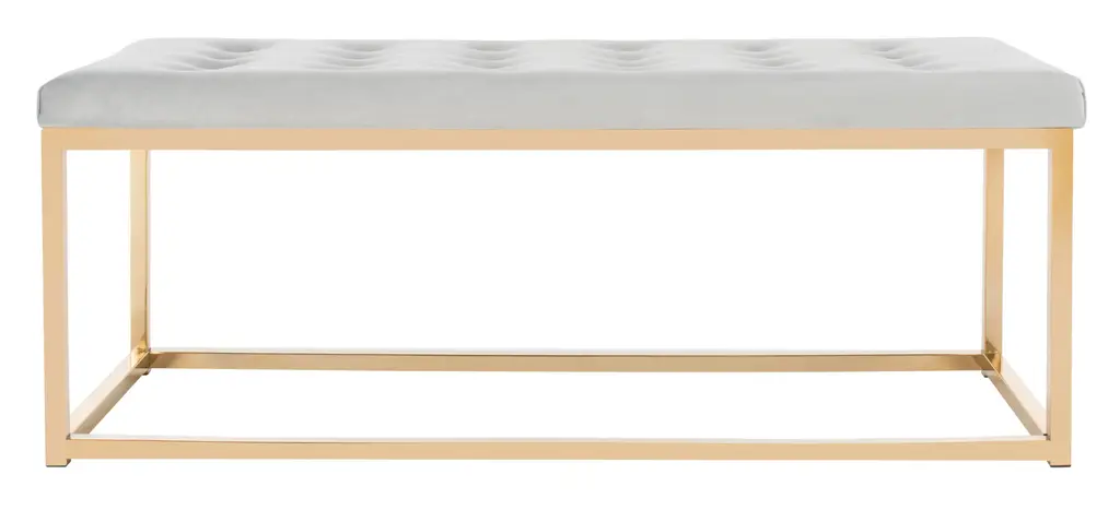 Graphic lines impart a designer look to the viewing bench, here with grey velvet leather tufted upholstery and brass Parsons-style legs. Universal in appeal, it adapts to industrial chic, contemporary or transitional spaces, from entry hall to the bedroom. To prevent overall soiling, frequent vacuum light brushing is recommended. Cushions and pillows should be turned on a weekly basis. Down-filled cushions should be brushed rather than vacuumed. Spot clean, using a mild water-free solvent or dry cleaning product. Only a professional cleaner should undertake a complete overall cleaning. The use of steam or water-based cleaners may cause excessive shrinking or staining. Some assembly required.