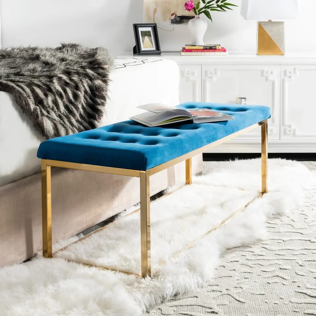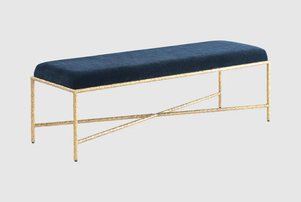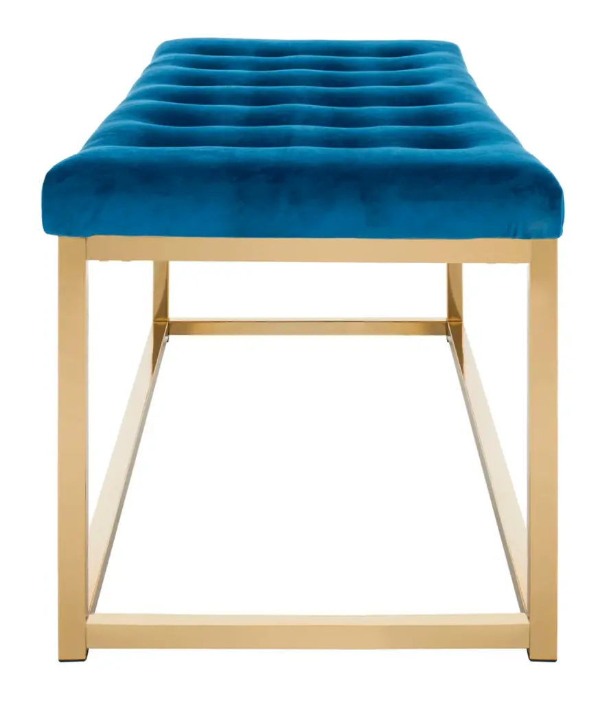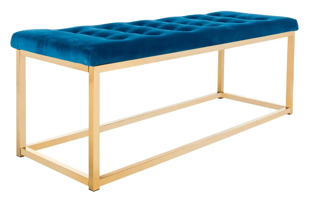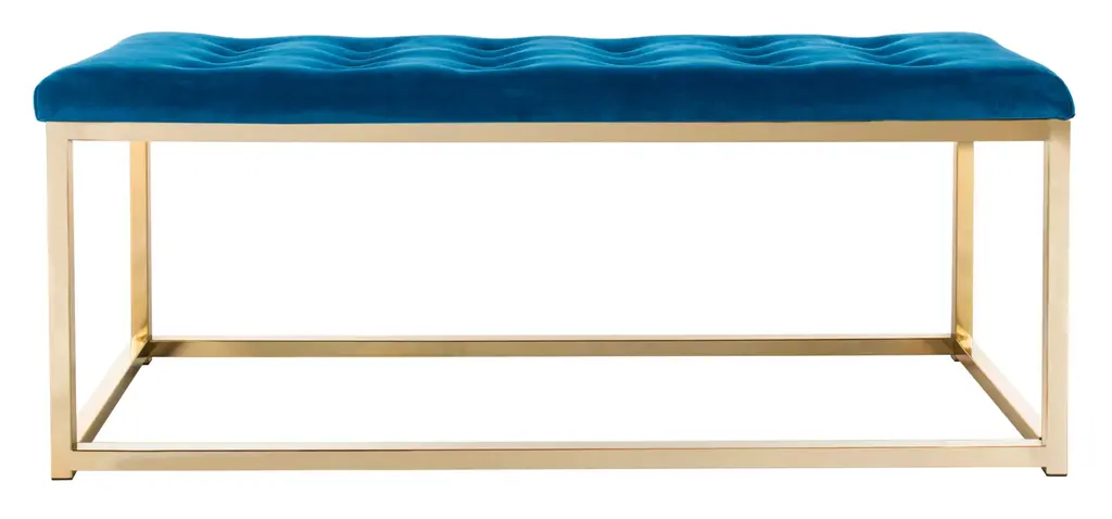 Graphic lines impart a designer look to the viewing bench, here with navy velvet leather tufted upholstery and brass Parsons-style legs. Universal in appeal, it adapts to industrial chic, contemporary or transitional spaces, from entry hall to the bedroom. To prevent overall soiling, frequent vacuum light brushing is recommended. Cushions and pillows should be turned on a weekly basis. Down-filled cushions should be brushed rather than vacuumed. Spot clean, using a mild water-free solvent or dry cleaning product. Only a professional cleaner should undertake a complete overall cleaning. The use of steam or water-based cleaners may cause excessive shrinking or staining. Some assembly required.