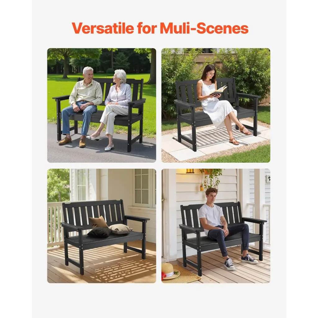 Feature: Built for the Outdoors: This outdoor bench is made of premium polystyrene that withstands water, rain, and snow. It stands up to all weather conditions without cracking or warping—no special maintenance required Classic Design: Our patio bench features a classic slatted seat with a wood-look finish, blending seamlessly into both modern and vintage outdoor spaces Comfortable Seating: Measuring 50.5 inches and supporting up to 800 lbs, this patio bench comfortably seats 2-3 people. The curved seat relaxes your hips and legs, while the >90° backrest and armrests encourage a more natural and open posture Quick and Easy Assembly: This park bench is easy to put together—just connect the preassembled parts. All required hardware and step-by-step instructions are included for a fast setup experience Cozy Outdoor Vibes: Whether placed in a garden, patio, porch, poolside, or backyard, this outside bench creates a warm and inviting spot to relax and enjoy the sunshine with family and friends Package Content: 1 x Outdoor Bench with Installation Hardware 1 x User Manual