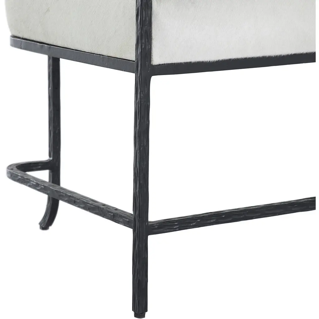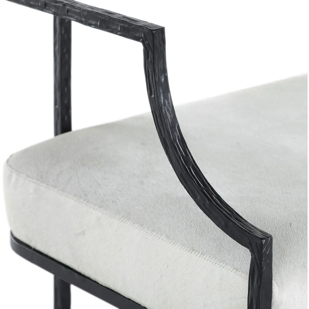 The Victor Bench brings a touch of glamor with its pale ivory hair-on-hide seat cushion framed in a clean-lined matte black finish. Inspired by the modern baroque style of the 1920s, this bench offers a minimalist yet luxurious aesthetic. Ideal for entryways, living rooms, or bedrooms, it enhances any decor with its chic design and elegant materials, making it a standout piece in any setting.