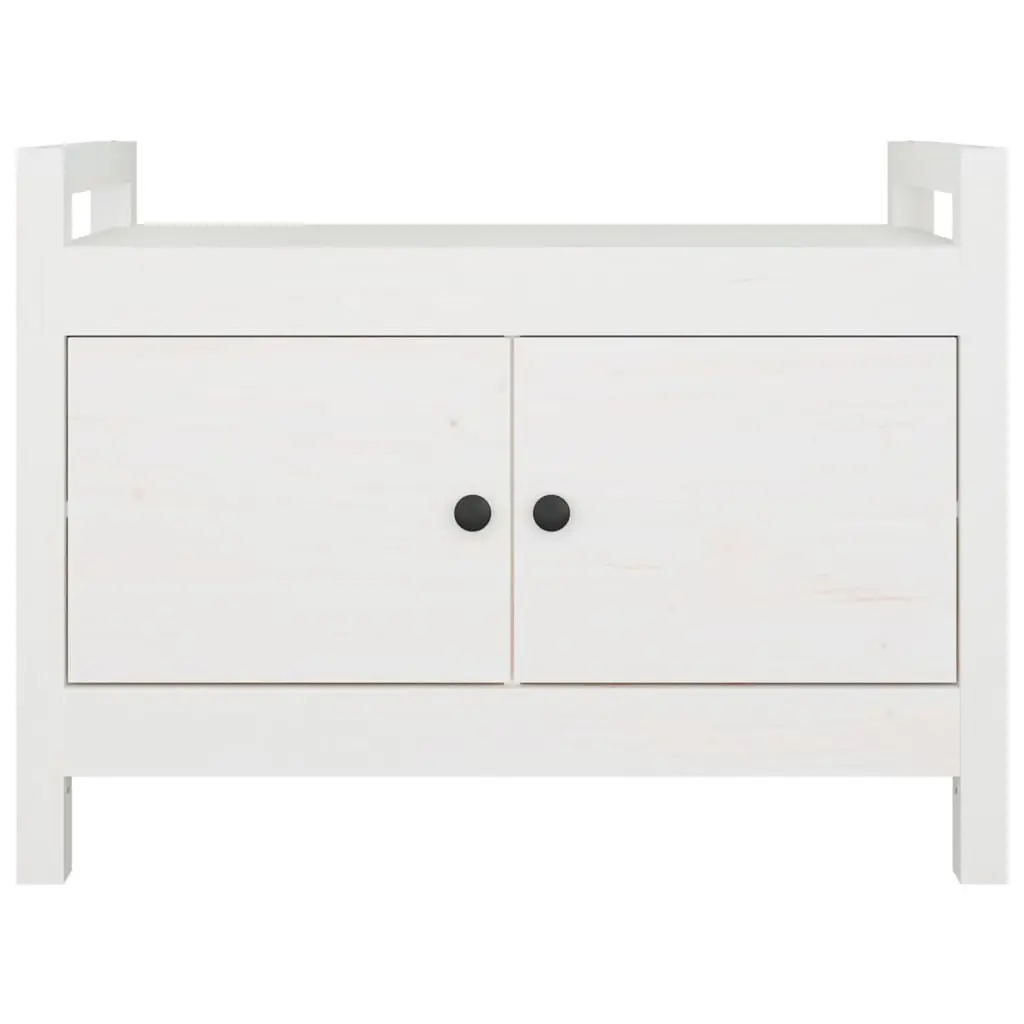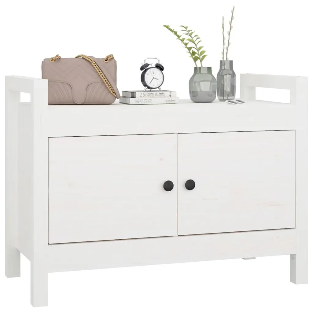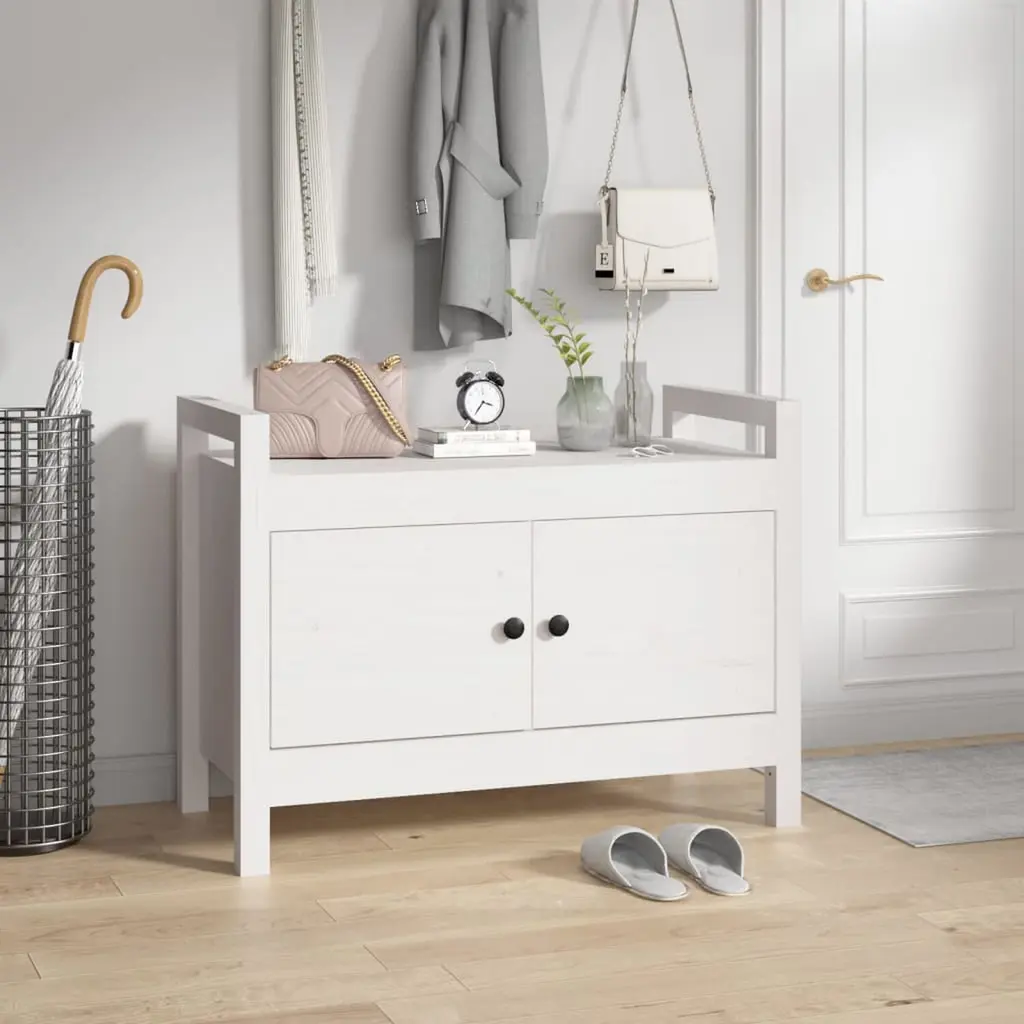 This Rustic White Hall Bench is a smart and stylish way to add some seating and storage to your entryway or foyer. Made from solid pine wood, it has a lovely white finish that fits any decor style, whether modern or classic. With a seat width of 31.5 in and depth of 15.7 in, it comfortably fits one person and adds a charming touch to your space. Loads of Storage: The hall bench has handy doors to keep your shoes and outdoor gear tidy and dust-free, making your mornings easier.Stylish Design: With its rustic white finish and smooth texture, it brings a modern touch to your home.Sturdy Build: Made from solid pine wood, this bench is built to last, ensuring you can enjoy it for years.Multi-Use: Perfect for busy households, this bench is a brilliant addition to entryways, hallways, or living rooms, doubling up as seating and storage.Easy Maintenance: Keeping this bench looking fresh is a breeze; just wipe it down with a damp cloth and dust it occasionally.