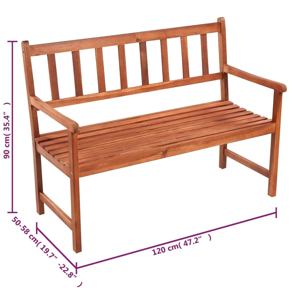 This patio bench is a fantastic addition to any garden or patio, mixing rustic charm with a practical design. Made from solid acacia wood and a comfy cushion, it creates a warm, welcoming vibe for chilling or hanging out. Built to Last: With strong solid acacia wood, this bench is made for the long haul, making it perfect for the great outdoors. It’s sturdy enough to fit three people comfortably.Stylish Cushion: The cushion that comes with it amps up your comfort level, sporting a design that matches the wood nicely. Its tie closure keeps it snug and secure all day.Flexible Placement: Great for outdoor areas like gardens, patios, or balconies, this bench gives you a nice spot to kick back and relax. Its retro design makes for a welcoming area, perfect for family and friends to gather.Low Maintenance: The oil finish not only brings out its natural beauty but also protects the wood from the elements. With a bit of care, it’ll keep looking good for years to come.Spacious Design: At 47.2 inches long and 19.7 inches deep, this bench seats three people easily, making it ideal for entertaining or simply enjoying the outdoors.