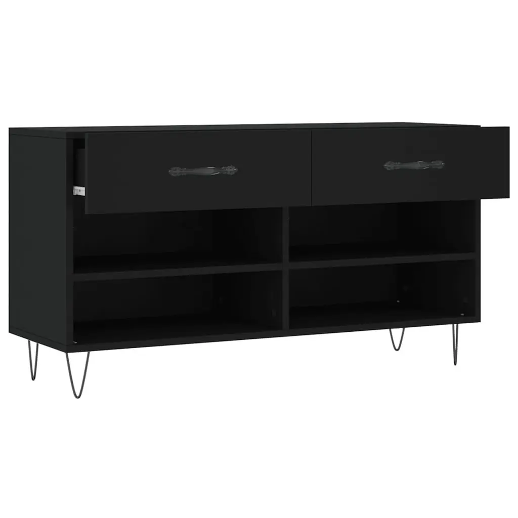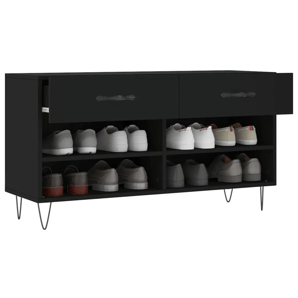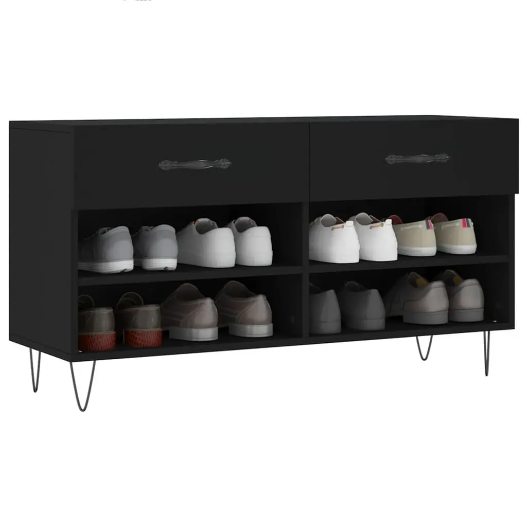 This Modern Black Shoe Storage Bench mixes style and practicality for your entryway. Its sleek design and plenty of storage make it perfect for keeping shoes tidy while giving you a comfy spot to sit. Ample Storage Capacity: This shoe bench has plenty of compartments, including four shelves and two drawers, so you can store all types of shoes without a worry. Durable Construction: Made from tough engineered wood with sturdy iron legs, this shoe unit is built to handle day-to-day life while looking sharp. Modern Design: With a sleek black finish and clean lines, this shoe bench fits in with any entryway or living room décor. Multi-functional Use: Great for hiding shoes in the hallway, this bench provides both storage and seating, making it a lifesaver for busy homes. Easy to Maintain: The smooth surface resists stains and is easy to wipe clean, helping your shoe bench look sharp.