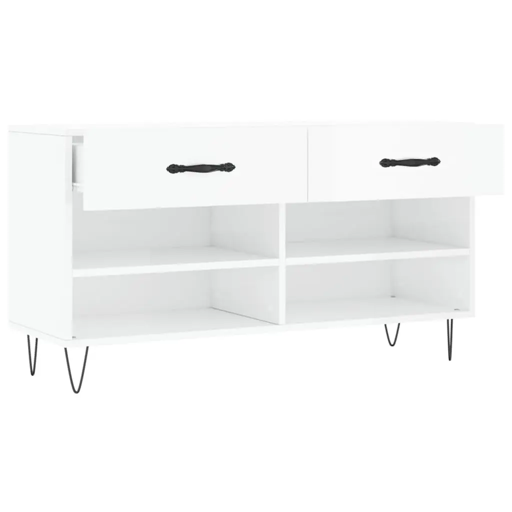 This Modern High Gloss White Shoe Storage Bench is here to spruce up your hallway while giving you the storage you need. With its shiny surface and roomy design, this bench adds style to your decor and gives you a handy spot to sort out your shoes, keeping your entryway tidy and welcoming. This shoe storage bench’s high gloss white finish gives it a modern look while keeping it clean and classy. The shiny surface makes your hallway shine brighter and feel roomier.Made from tough engineered wood, this bench promises durability and stability, so it’ll stand up to everyday use. The materials have been picked to provide a quality experience every time.With four shelves and two drawers, it has plenty of space to neatly store all kinds of footwear and keep your area clutter-free. The storage design is practical and user-friendly, making it easy to grab what you need.The iron hairpin legs focus on style too, and they’re at the perfect height for comfy sitting. These legs keep the bench sturdy and secure for everyday use.This versatile bench is a great fit for hallways or living rooms, suiting all sorts of styles. It’s meant for indoor use only and works well for adults and all kinds of shoe collections.