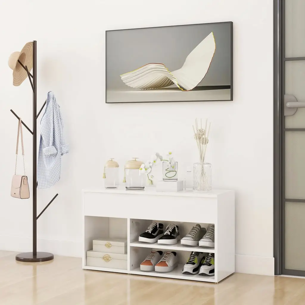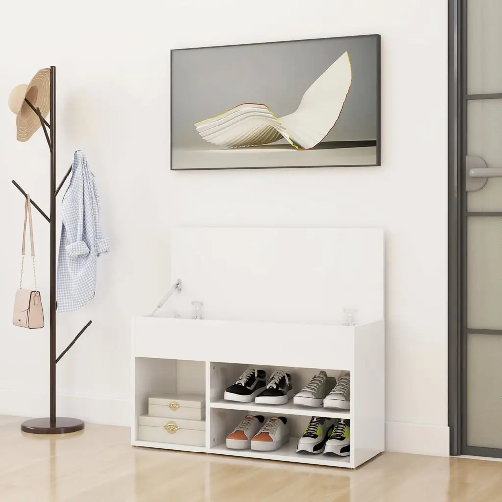 This shoe storage bench blends style and practicality, flaunting a sleek high gloss white finish that fits perfectly with any modern interior. Perfect for hallways or entryways, it offers a handy spot to sit while keeping your shoes stored and easy to grab. Chic high gloss finish dazzles and complements your decor.Lots of storage with two compartments and two shelves for neat shoe storage.Made of engineered wood, the surface is smooth and easy to clean for everyday use.Compact size of 31.5 in long and 11.8 in deep is just right for narrow areas.Versatile for hallways, bedrooms, or living rooms – fits right in wherever you need it.