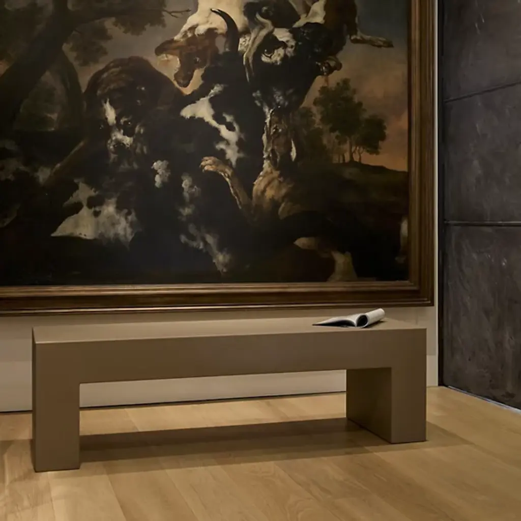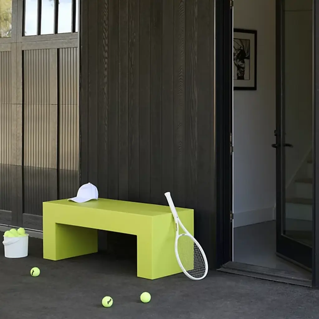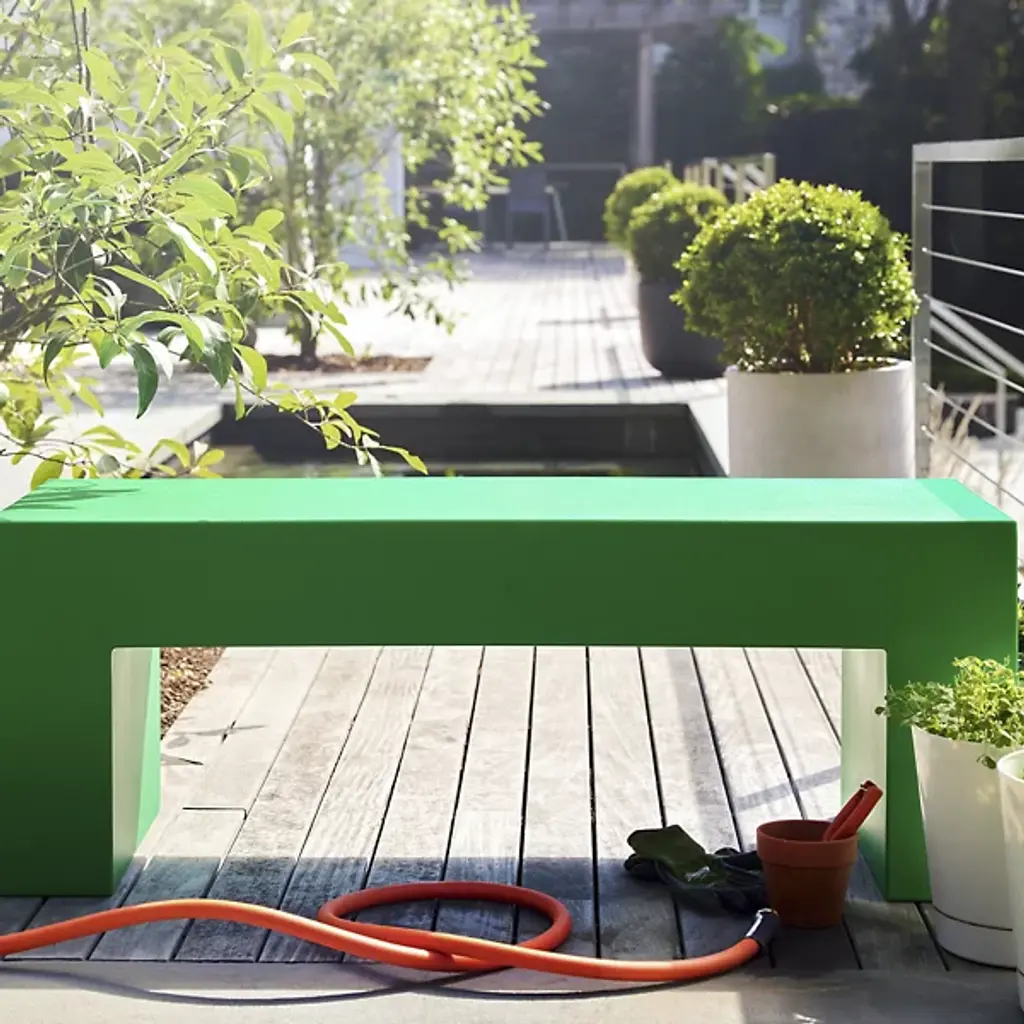 A bench that's long on contemporary style as well as convenient seating. At 6 feet wide, the Heller Furniture Vignelli Bench can easily seat 3 people. While it looks like concrete, the Outdoor Bench is actually made out of one piece of grey polyethylene, which ensures the bench's durability in just about any setting, indoors or out.