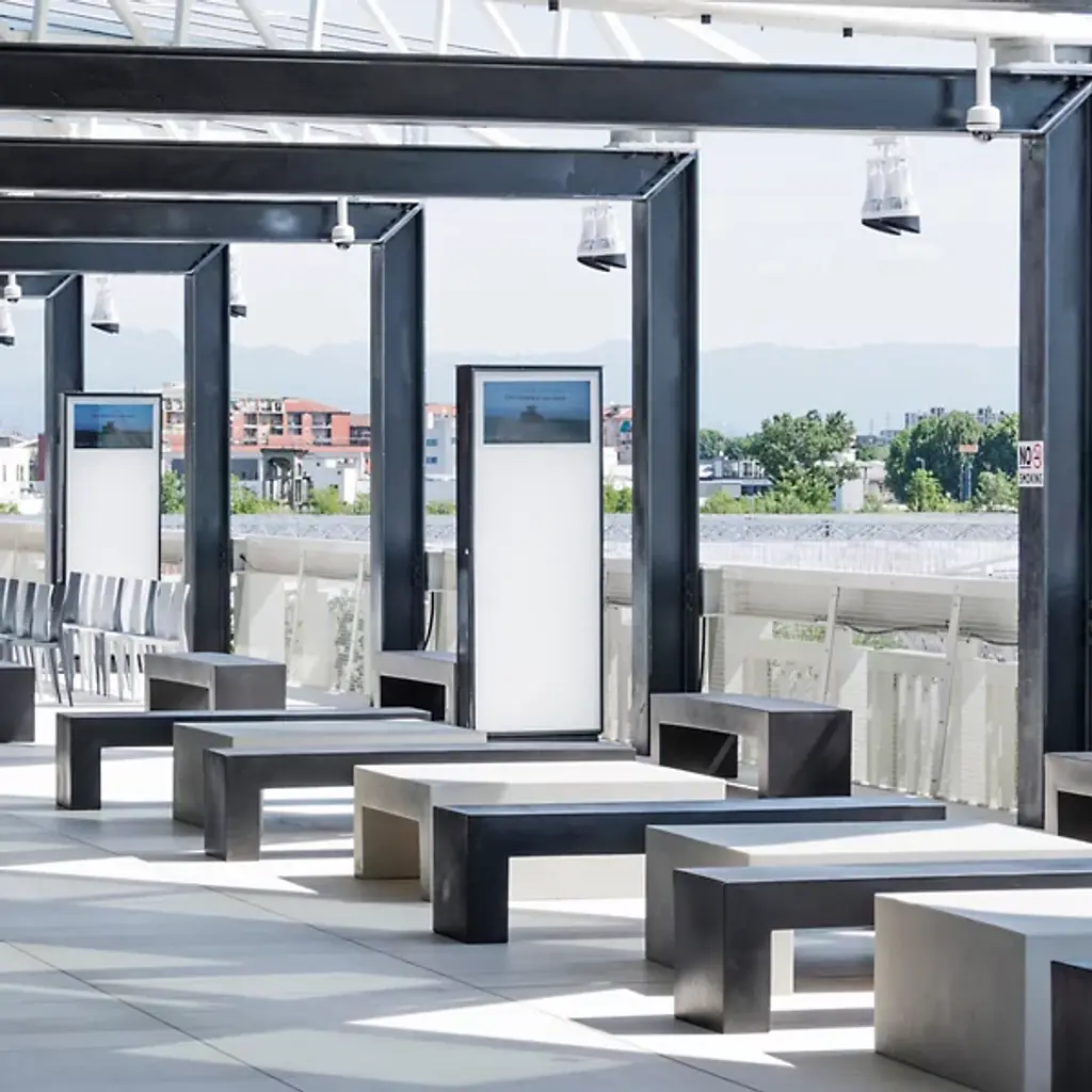 A bench that's long on contemporary style as well as convenient seating. At 6 feet wide, the Heller Furniture Vignelli Bench can easily seat 3 people. While it looks like concrete, the Outdoor Bench is actually made out of one piece of grey polyethylene, which ensures the bench's durability in just about any setting, indoors or out.